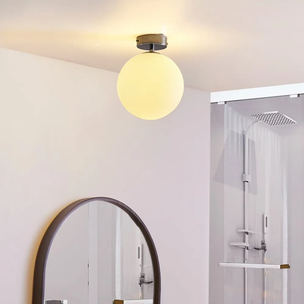 Maviris ser elegant og passende ud på badeværelset med den kugleformede skærme. Takket være den hvide glasoverflade skaber den også et meget blødt og behageligt lys, som ikke blænder. Loftarmaturet i krom danner en smuk kontrast, og det passer godt til alle armaturer i badeværelser og toiletter, da disse som regel også er i en skinnende og legende kromtone. Loftarmaturet fuldendes teknisk af de effektive LED’er, der lyser i varm hvidt lys og giver et forholdsvis klart lys med et lavt forbrug