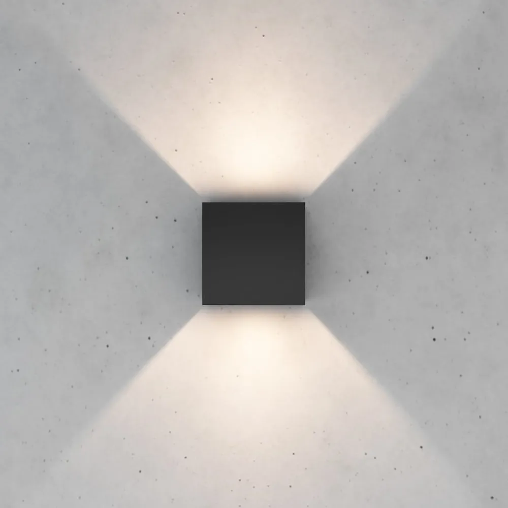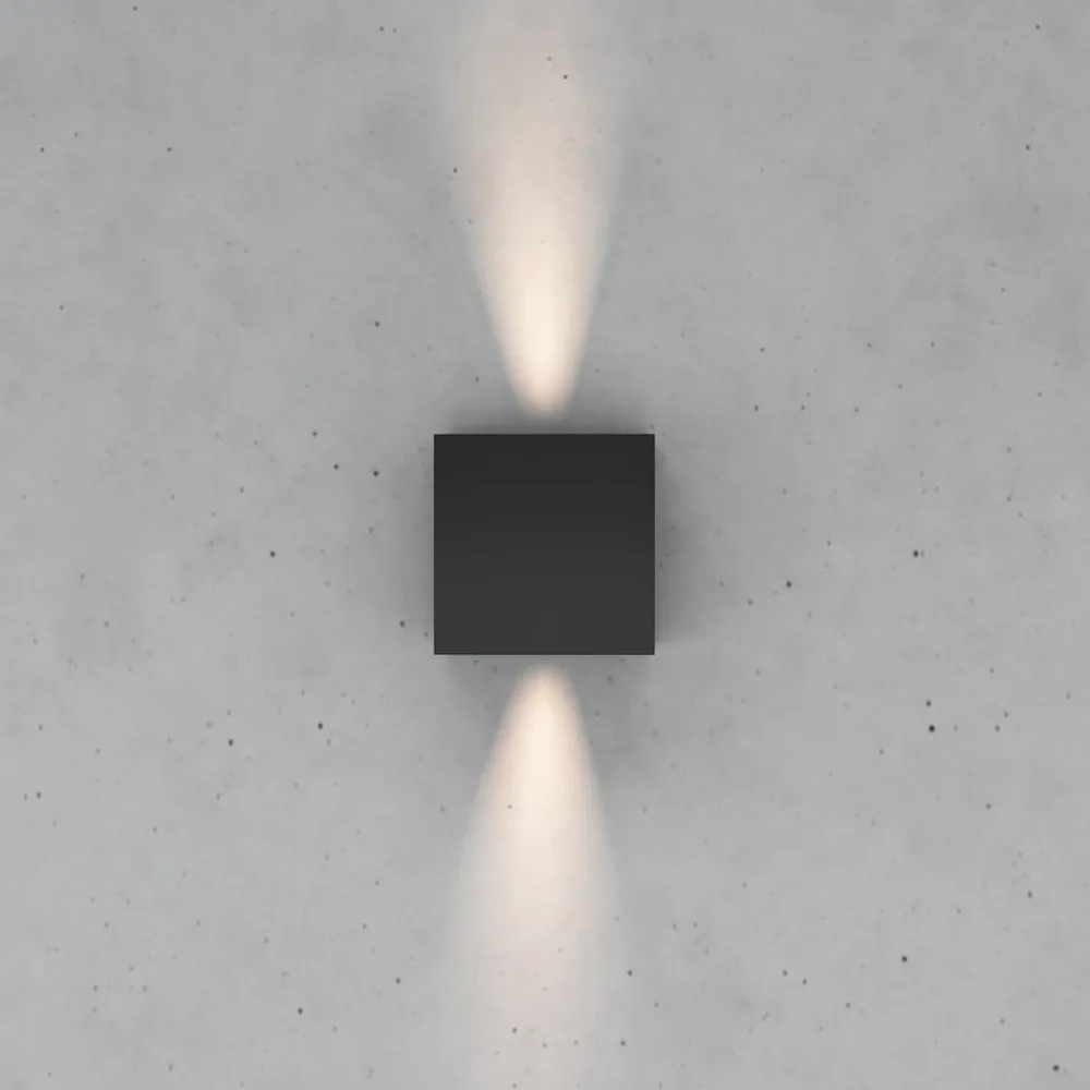 Kubusformet Zuza 2-væglampe, fordeling i top og bund Zuza 2-væglampen, der er fremstillet af metal i en enkel kubusform, er udstyret med en G9-fatning inde i kroppen. Lyset fra den pære, der skal bruges, sendes ud gennem åbningerne i toppen og bunden, med fire hængslede vinger, der gør det muligt at justere strålevinklen individuelt.