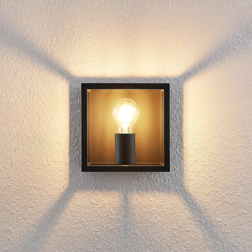 Meron er en af de moderne lyskilder, som også kan ses i et vintage miljø. Armaturhuset er designet i en helt lige linje og minder om et bur. Siderne er helt frie, fordi lampeskærmen strengt taget kun består af rammestøtter. Som følge heraf spiller lyskilden en særlig rolle med hensyn til udseende på grund af sin store tilstedeværelse. Lampen skal derfor passe godt ind i det overordnede look og skal helst have et glødelampe-look. Væglampens metaloverflade har fået en mørkegrå finish, som giver et cool og stilfuldt look.