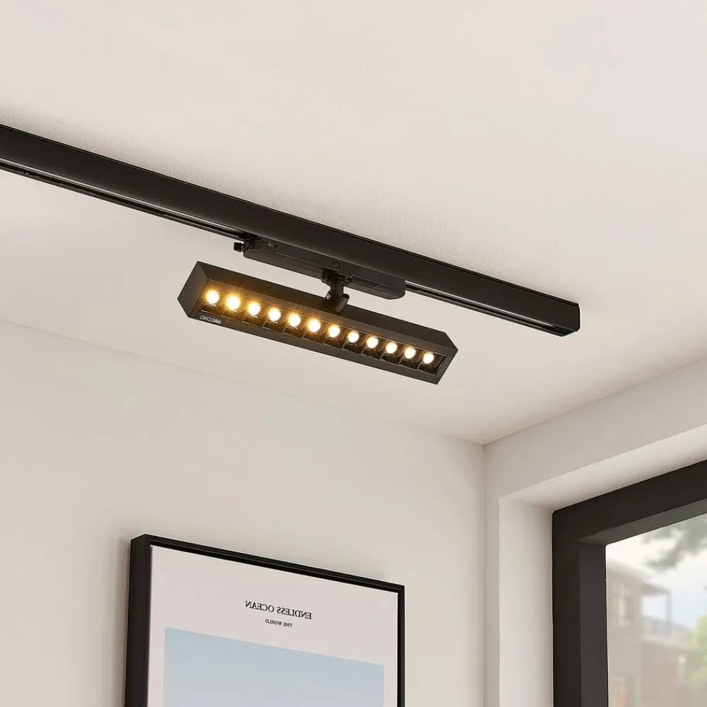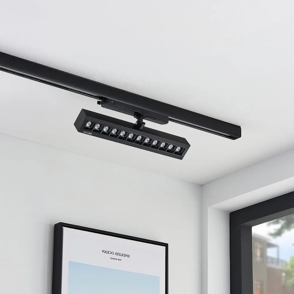 Sort, drejelig Millay LED-skinnespotlight med blændfrit, flimmerfrit lys, UGR < 15 Millay er et LED-spotlight designet til brug med et 3-faset skinnesystem. Armaturet er ideelt til brug i et kommercielt miljø, f.eks. som butiksbelysning eller på et kontor, fordi spotlightet har mange fordele at byde på. Den giver et blændfrit og derfor meget behageligt lys, belysningen er også flimmerfri, og spotlighten kan drejes, så lyset kan justeres individuelt og tilpasses kravene på stedet. Både den sorte overflade og det overordnede design virker meget moderne. Lyset er stærkt og effektivt takket være moderne LED-teknologi – til 3-faset skinne – flimmerfri – blændfri – UGR < 15 – SDCM < 4 – drejelig
