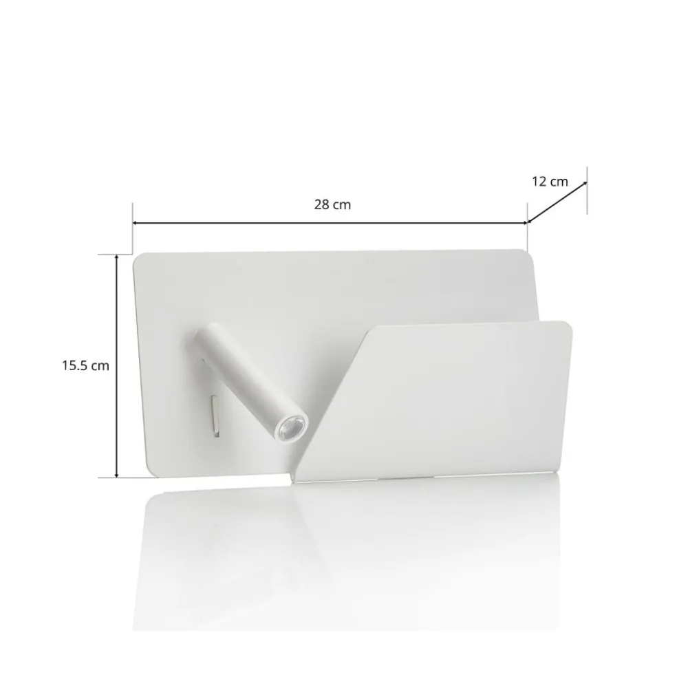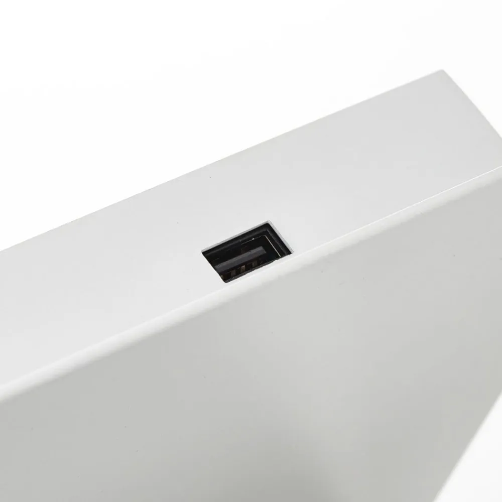 LED væglampen Suau, som er blevet tegnet af designerduoen Nahtrang, er et ægte multitalent blandt væglamper. Den er takket være den integrerede LED teknik ikke kun særdeles energieffektiv, men også særdeles praktisk takket være den kompakte hylde. Derudover er der integreret et USB ladestik, som gør det muligt at oplade mobilen eller tabletten bekvemt og sikkert opbevaret i holderen. Spotten kan justeres individuelt, hvilket muliggør en målrettet belysning. Lyset fra de fast installerede LED’er afgives blidt til omgivelserne og oplyser dem med ca. 3.000 kelvin i en varm hvid farve. Takket være sit mathvide metalstel integreres Suau harmonisk med det tilstedeværende interiør. (inkl. vippekontakt)