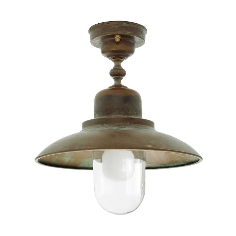 Atmosfærisk oplyst Turino loftlampe med et antikt look Turino loftlampen kan bruges til stilfuldt at forbedre og vidunderligt fremhæve udendørsarealer. Lampen er kendetegnet ved sit enkle design og den antikke messingoverflade, som er skabt ved hjælp af en kemisk proces. Lyset udsendes over et stort område gennem den gennemsigtige glaskrop, som ligger beskyttende omkring E27-pæren, hvilket oplyser omgivelserne ideelt og skaber en behagelig atmosfære. Turino er også modstandsdygtig over for den salte luft, der findes i nærheden af havet (saltvandsresistent).
