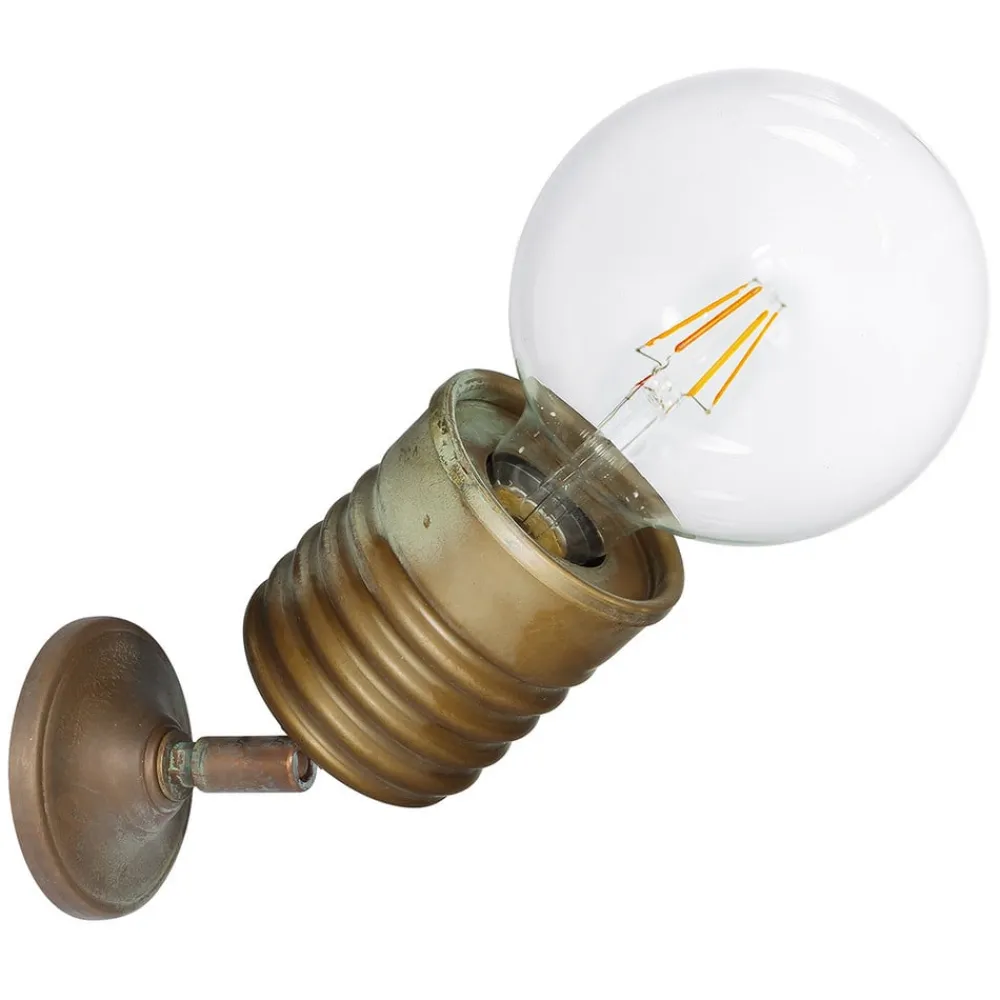 Bringer industriel charme ind i stuen – Orti væg- eller loftslampe Den industrielle Orti væg- eller loftslampe er lavet af antik messing og har et puristisk design. Den har en E27-fatning, som kan placeres individuelt ved hjælp af det indbyggede kugleled. Da man bevidst har udeladt en lampeskærm fra designet, giver væglampen et ensartet lys hele vejen rundt. Lampen har også en særlig nostalgisk effekt, når den kombineres med en globepære (se tilbehør).