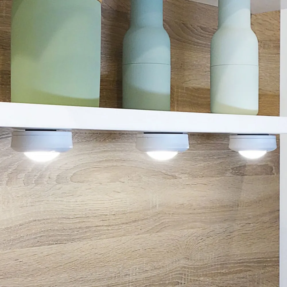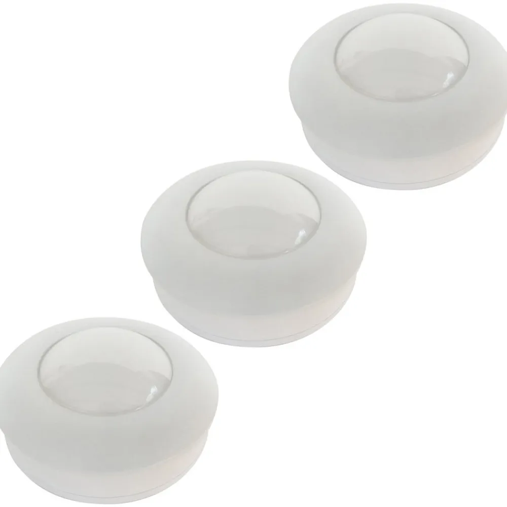 De tre runde LED-lamper Alio Push fastgøres på skabe, hylder eller andre glatte overflader ved hjælp af magnetiske klæbestrimler. De er batteridrevne og kræver 9 AA-batterier (medfølger). De tre lys kan tændes og slukkes med den medfølgende fjernbetjening.