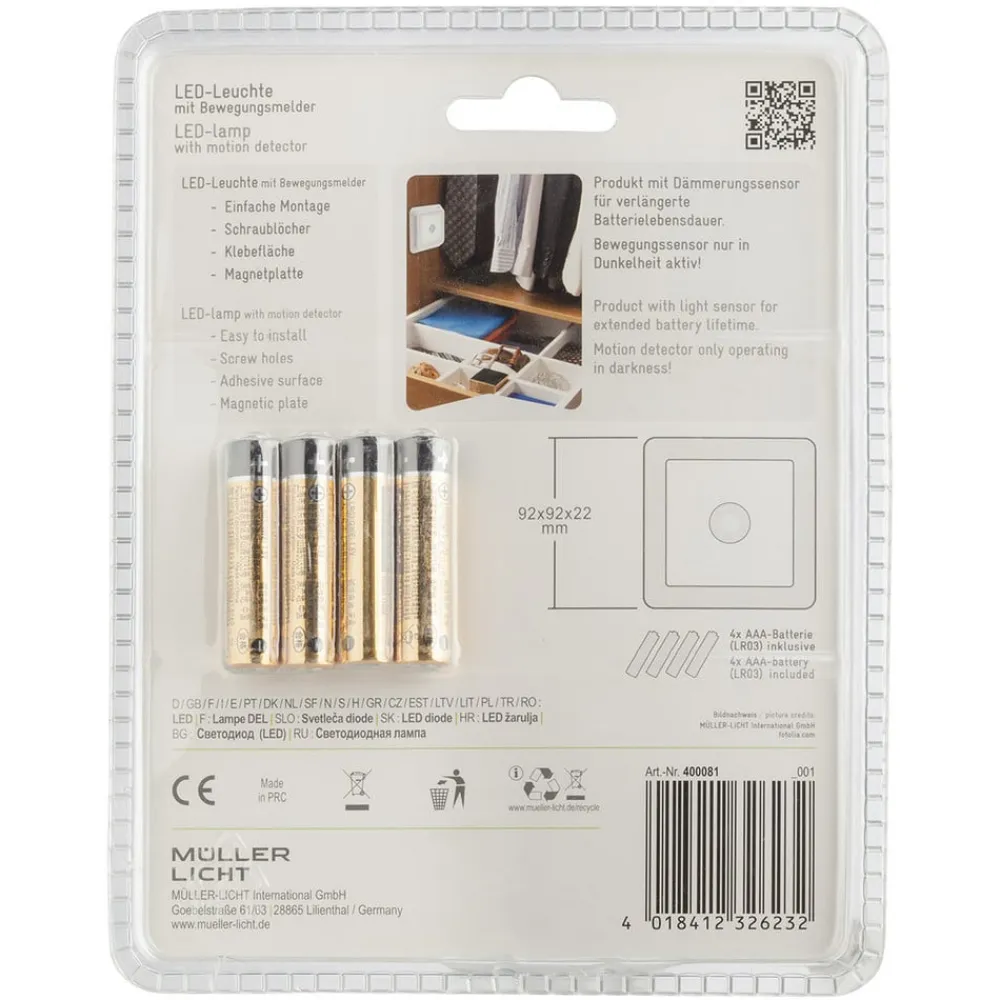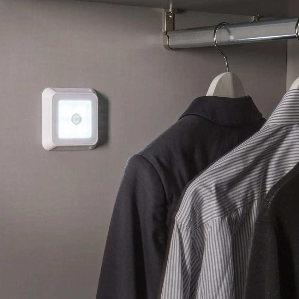Square Light – selvklæbende, batteridrevet LED-lys til garderobeskabe m.m.I garderobeskabet, garderobeskabet m.m. giver Square Light LED-møbellampen lys, så snart der er brug for det, takket være den integrerede sensor. Udstyret med en dagslyssensor og en bevægelsessensor tændes lyset automatisk i mørke, når sensoren registrerer bevægelse. Den kantede møbellampe til overflademontering er udstyret med en selvklæbende bagside og en magnetisk holder. Batterierne (4 x AAA) er inkluderet.