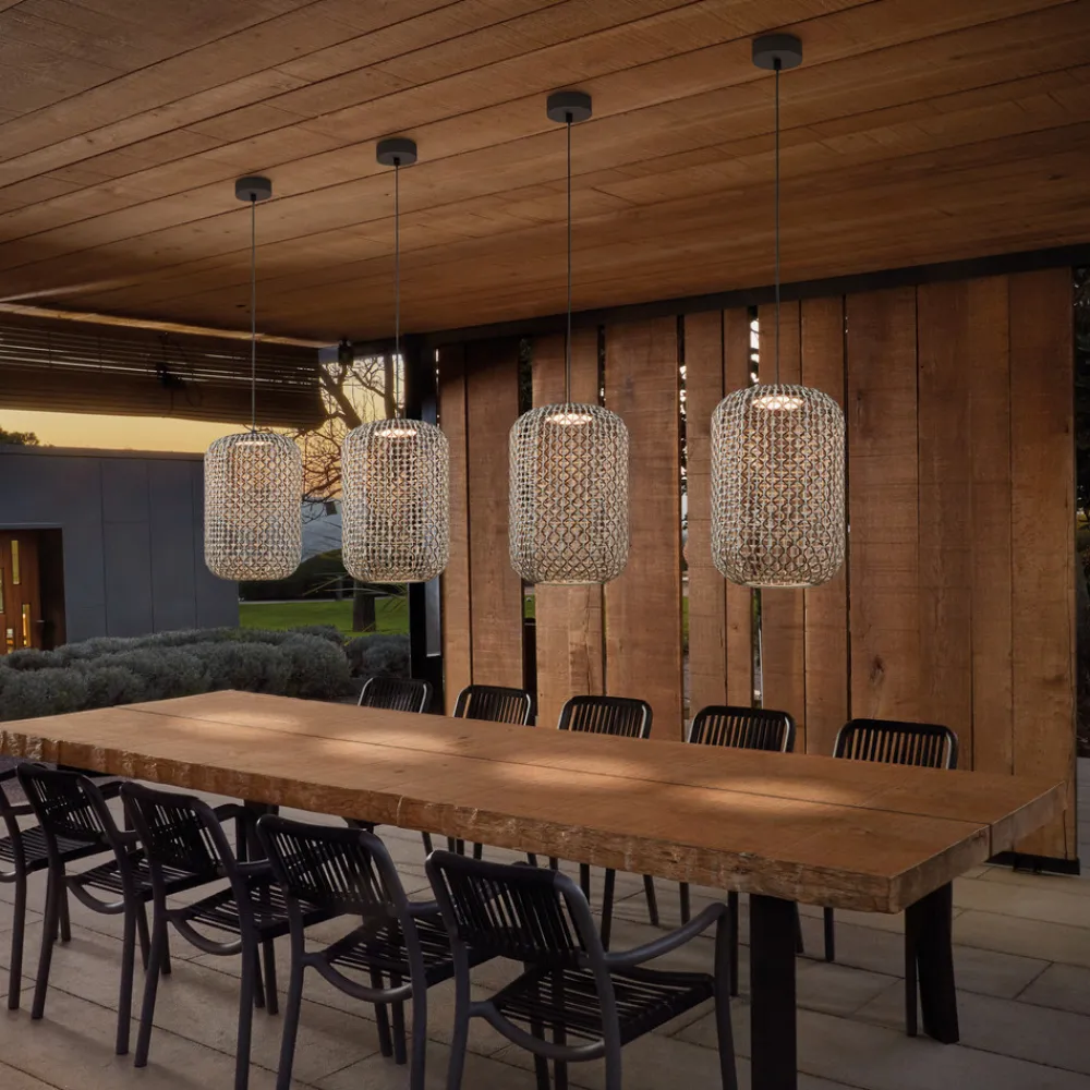 Designer udendørs pendel Nans A med vævet skærmDesignfirmaet Bover, der har base i Barcelona, legemliggør middelhavsstilen med sine Made in Spain-produkter. Pendellampen Nans er designet til udendørs brug, men kan også bruges indendørs. Den cylindriske skærm er vævet af en syntetisk fiber, hvor forskellige farvede tråde er vævet ind i hinanden. Pendlen er triac-dæmpbar, lysdæmperen er ikke inkluderet.