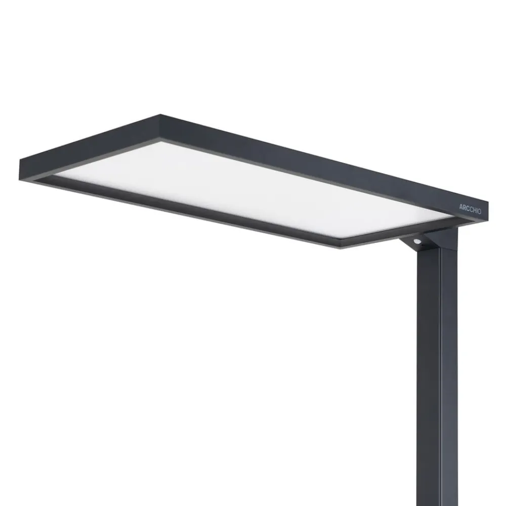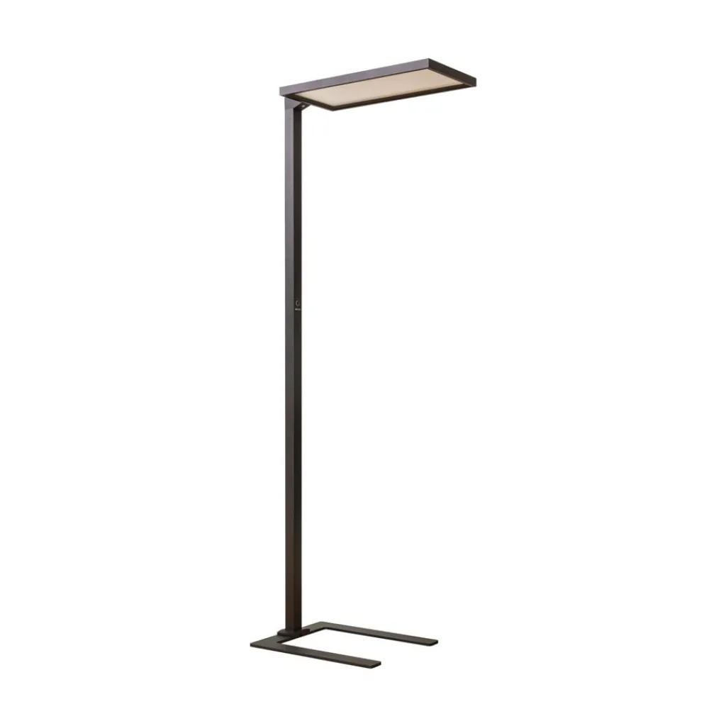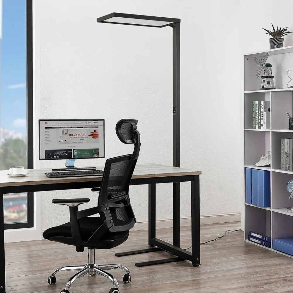 Flimmerfri LED-gulvlampe til kontor Nelus i sort med dagslyssensor og touchdæmper, U-formet fod Denne LED-gulvlampe er den ideelle tilføjelse til mange kontorer og en lyskilde med et funktionelt udseende og særlige funktioner. Lyset udsendes jævnt opad og nedad for et afbalanceret forhold mellem direkte og indirekte lys. Udstyret med en lysdæmper, som kan betjenes via touchpad’en, samt en dagslyssensor og en bevægelsessensor, tilpasser lyset sig perfekt til omgivelserne og muliggør koncentreret arbejde ved computerarbejdspladsen. Gulvlampen med sine universalhvide LED’er giver et klart, men alligevel energibesparende lys, som kan dæmper efter behov. Derudover tilpasser lyset sig perfekt til de aktuelle lysforhold via dagslyssensoren, som registrerer den omgivende lysstyrke, og giver dermed konstant lys hele dagen og, hvis det er nødvendigt, også om aftenen. Hvis der ikke sidder nogen ved bordet, sørger den integrerede bevægelsessensor for, at armaturet slukker efter 30 minutters fravær. Foden er U-formet og kan derfor også nemt placeres omkring bordben.