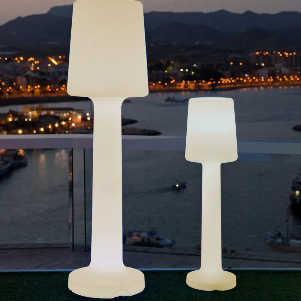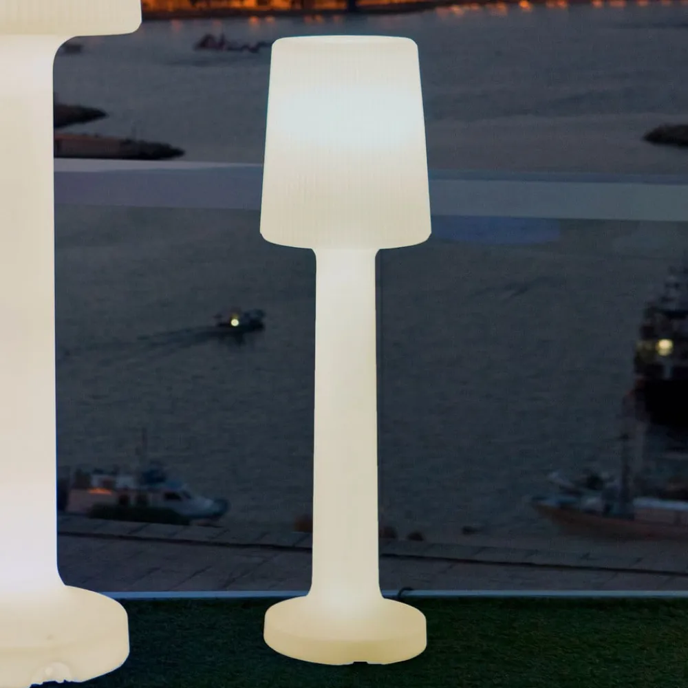 Carmen gulvlampe til indendørs og udendørs brug med rillet skærm Carmen gulvlampen er fremstillet udelukkende af UV-bestandig og robust polyethylen, hvilket gør den velegnet til både indendørs og udendørs brug (kapslingsgrad IP65). Lampen med den slanke base får et særligt sofistikeret præg af den rillede lampeskærm, som får den til at skille sig visuelt ud fra stellet. Lampen leveres med en LED-pære i form af et LED-rør. Det oplyser hele armaturet, og det gennemskinnelige materiale gør, at lyset stråler jævnt hele vejen rundt. Carmen er et alsidigt armatur, der kan placeres på mange forskellige måder til private udendørsarealer eller til udendørsarealer i cateringvirksomheder, og armaturet skaber også en strålende accent indendørs, for eksempel i en hotellobby eller et spa-område.