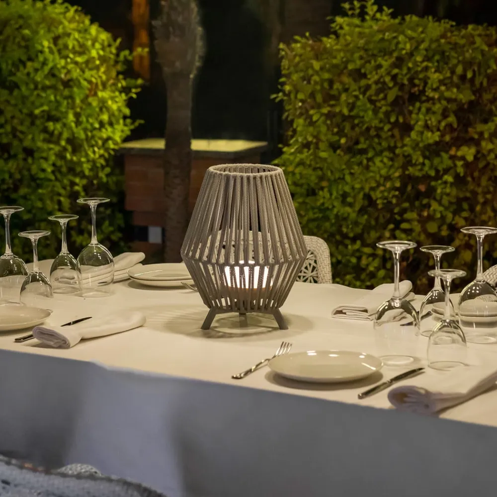 Taupefarvet Conta LED-bordlampe med genopladeligt batteri Denne smukke bordlampe med sin burlignende skærm kan bruges både indendørs og udendørs takket være dens IP54-beskyttelsesgrad. Kroppen på den trebenede bordlampe er lavet af genanvendt PVC og er særlig robust over for vejrpåvirkninger. Conta er udstyret med et genopladeligt batteri og en USB-port til praktisk batteriopladning. Der kræves også et ladekabel og en plug-in-strømforsyningsenhed (medfølger ikke). Conta leveres med en bærbar LED-lampe, som ikke behøver at blive installeret. Den sidder fast takket være den magnetiske base og tændes, slukkes og dæmpes med den medfølgende fjernbetjening.