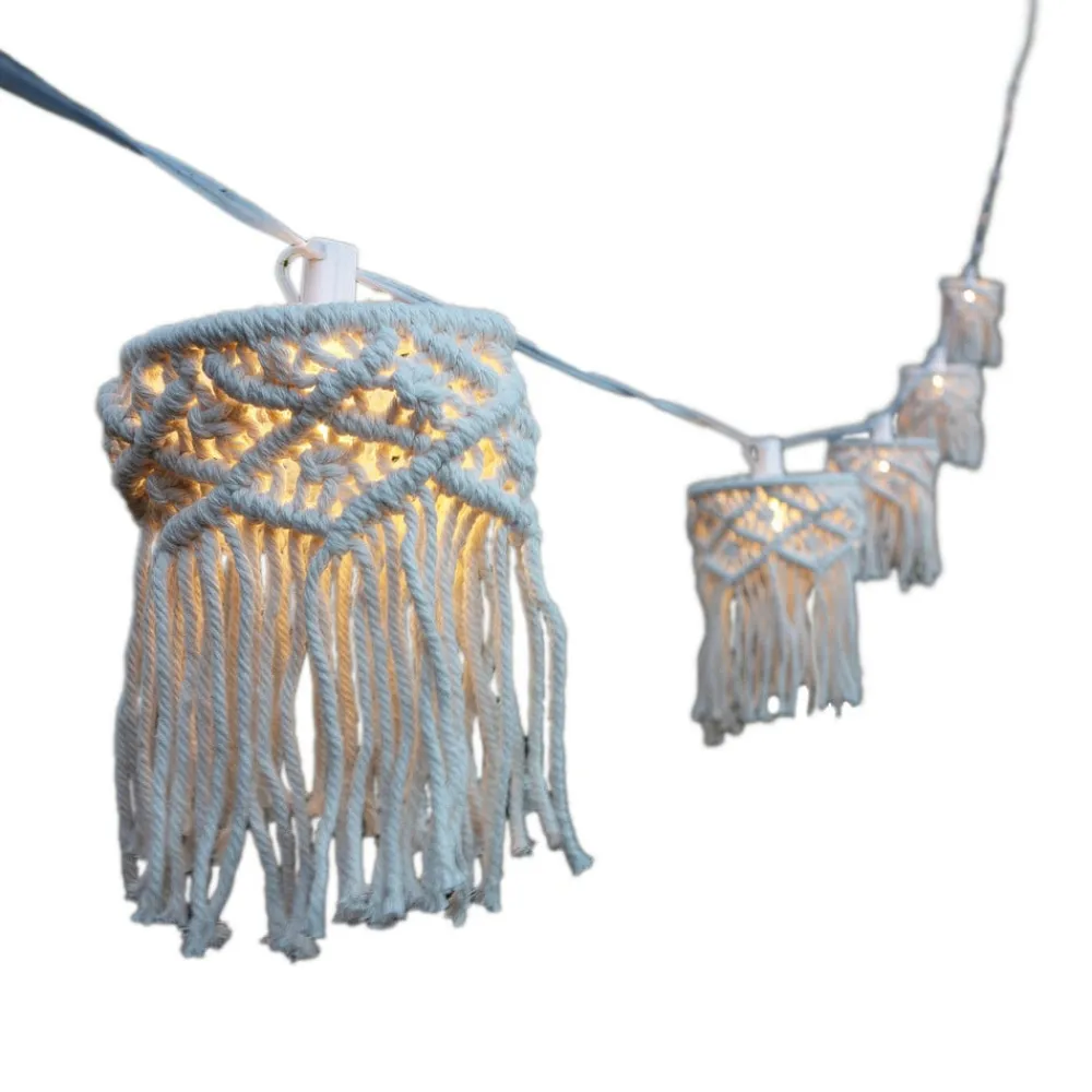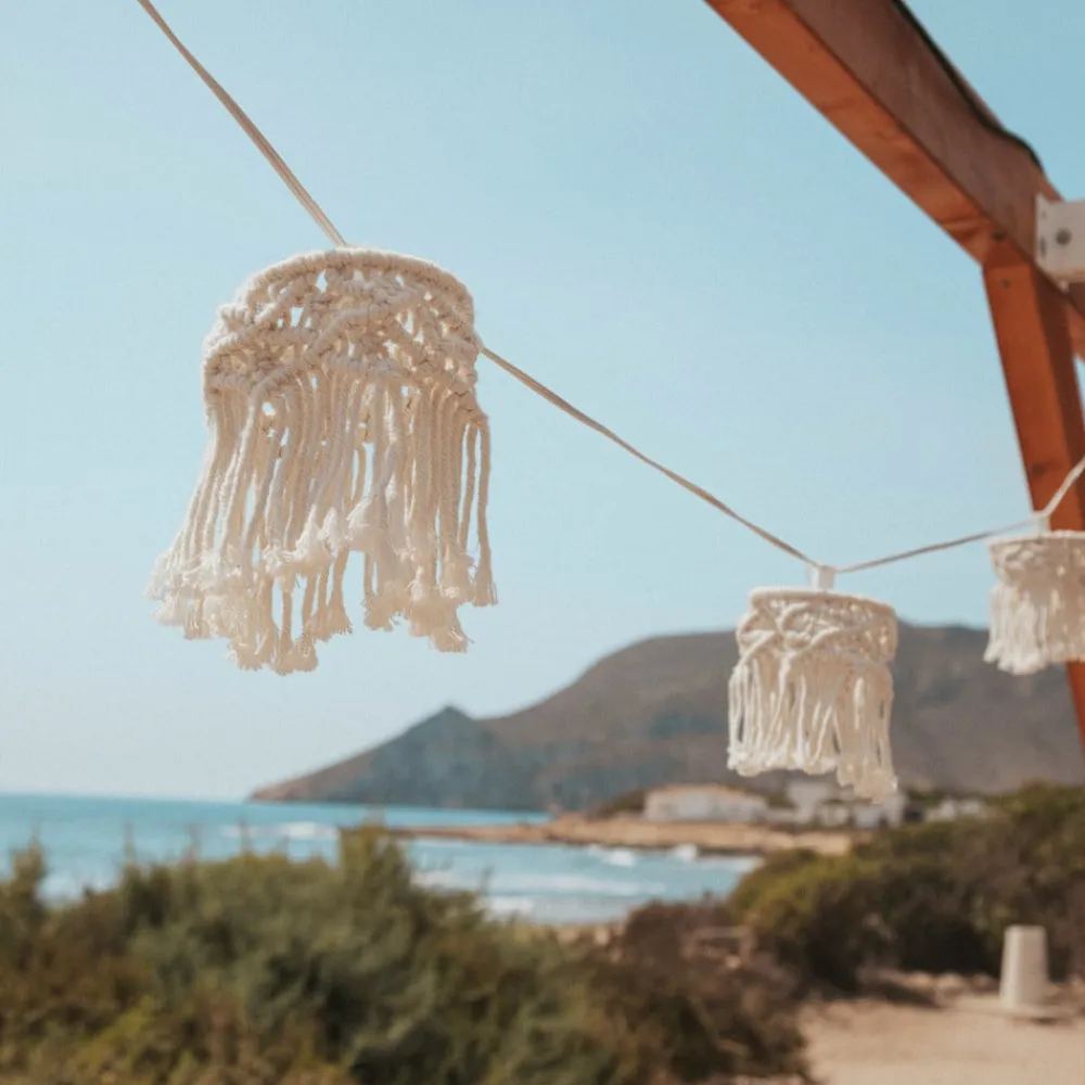 8 lyskilder Mykonos med solpanel og til opladning De dekorative, sommerlige Mykonos lyskæder med skærme af hæklet bomuld kan oplades ved hjælp af solenergi eller via en stikkontakt (USB-C-kabel medfølger, netadapter medfølger ikke). LED-pærerne medfølger, men kan udskiftes.