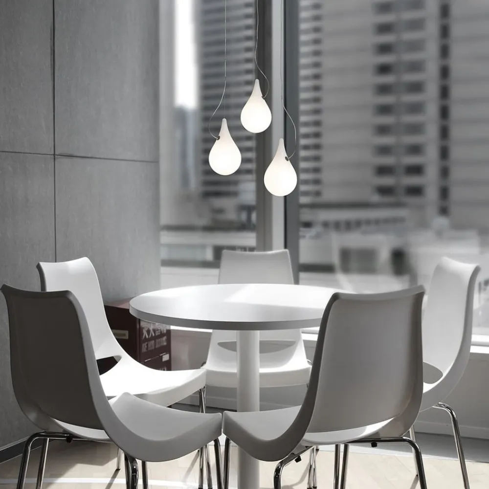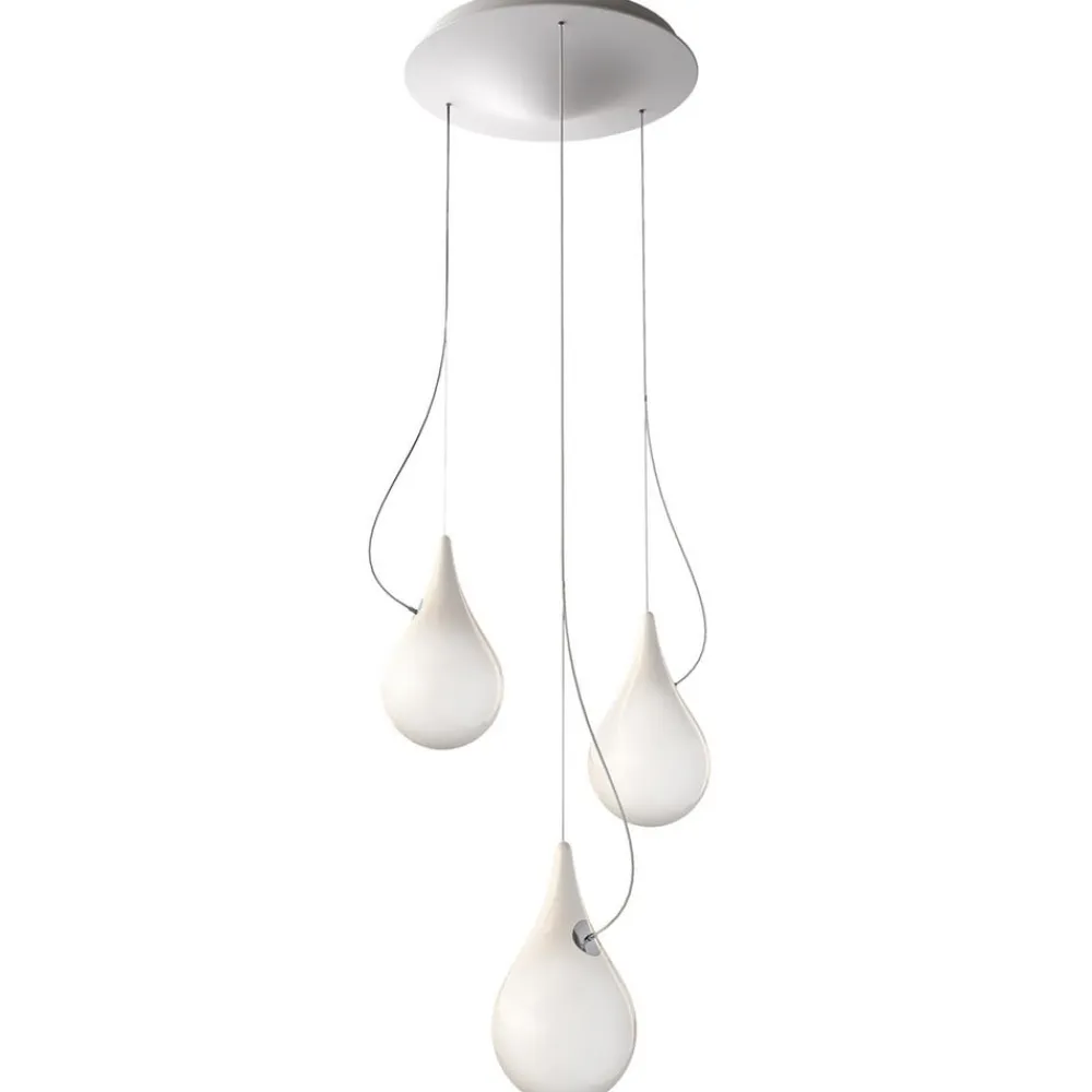 Modellen DROP-2 XS ligner lysende dråber, der langsomt falder ned fra loftet. Tre pendler er fastgjort til den runde baldakin og munder ud i en lille lampeskærm af polyethylen, der er formet som en dråbe. Den lukkede form på lampeskærmen giver et blændfrit og spredt lys. Lyset er desuden dæmpbar via husets installation.
