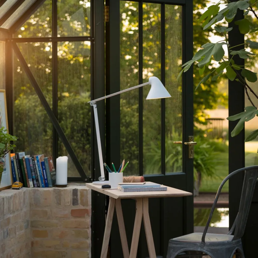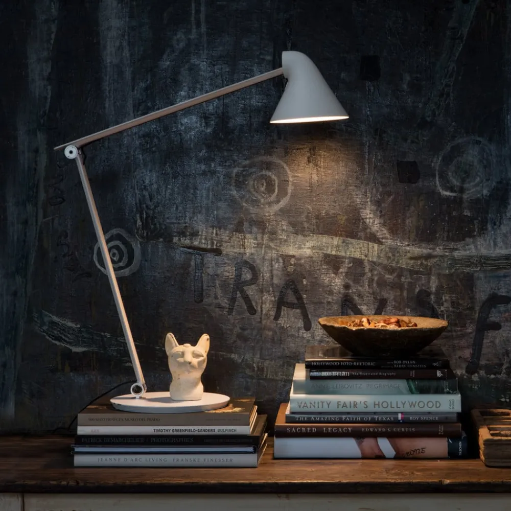LED-skrivebordslampe NJP – alsidig, justerbar og kombinerbar På sidebordet i læsehjørnet i stuen, på skrivebordet på hjemmekontoret eller på biblioteket – NJP-skrivebordslampen er en fleksibel lyskilde af høj kvalitet til læse- og arbejdsbelysning. Det japanske designstudie nendo, som blev grundlagt af Oki Sato, lagde ved designet af NJP særlig vægt på blændfrit lys, et klart udseende og ukompliceret betjening – kort sagt funktionalitet. De to hængsler, som er placeret over stålfoden og centralt i den pulverlakerede aluminiumsramme, er særligt iøjnefaldende. De gør det muligt at justere højden og fremspringet. Skærmen giver en ekstra mulighed for at justere justeringen af lysudsendelsen. Den er malet hvid på indersiden for effektiv lysudsendelse. Kontakten på lampehovedet giver adgang til timerfunktionen (4 eller 8 timer) samt et to-trins valg af lysstyrke. Bordlampen er et produkt fra den danske producent Louis Poulsen, som siden grundlæggelsen i 1874 har opnået stor erfaring med produktion af armaturer af høj kvalitet; NJP er også fejlfrit realiseret.