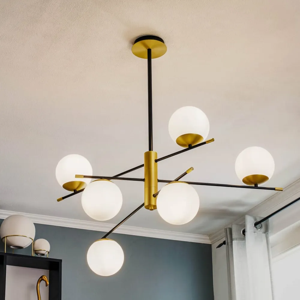 Lige linjer og sfærer – disse geometriske elementer bestemmer udseendet på den seks-flamme Nostalgi-pendel og giver, ligesom farverne mat guld, sort og hvid, en moderne elegance, der kan integreres i mange rum. Tre lige metalstænger er fastgjort til ophængningsstangen i midten. Dette skaber en lys rumbelysning fra en hængende lampe, der er en absolut iøjnefaldende, selv når den ikke er oplyst.