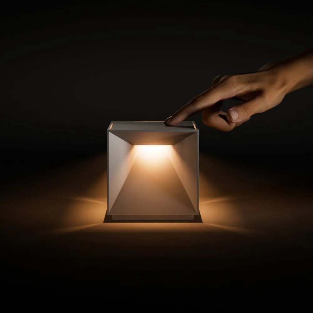 Justerbar varmhvid lysfarve: Nutalis LED-bordlampe, dæmper, varm CCT, Ra85, IP54 Praktisk til natborde, skriveborde og andre steder, hvor der er brug for et stort lysområde på lidt plads: Nutalis LED-bordlampen er en terningformet, genopladelig lampe, der udsender et stort lysområde. Terningens skrå sider reflekterer lyset på en elegant måde, så den ligner et kunstobjekt, når den er tændt. Takket være kapslingsgraden IP54 kan denne moderne bordlampe også bruges i beskyttede udendørs områder, f.eks. på altaner. Det integrerede genopladelige batteri giver behagelig belysning med varmhvidt lys i op til 9 timer, selv uden kabel. Lysfarven kan skiftes mellem 2.200 og 2.700 Kelvin. Derudover kan intensiteten dæmpes trinløst ved berøring. Både et USB-kabel med magnetisk opladningstilslutning og en matchende netadapter er inkluderet i leveringsomfanget, så Nutalis nemt kan oplades. Tekniske egenskaber – med genopladeligt batteri til trådløs brug (USB-kabel og netadapter medfølger) – farvetemperatur i varmhvid kan justeres ved berøring (2.200 / 2.700 K) – trinløs dæmpbar takket være integreret touch-dæmper – beskyttet mod stænkvand (IP54) – batterilevetid: op til 9 timer – opladningstid: 5-7 timer – genopladeligt batteri: Li-Ion, 4.400 mAh – robust stativ på grund af sin egen vægt (560 g)
