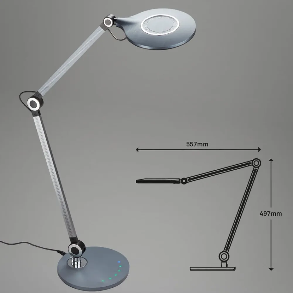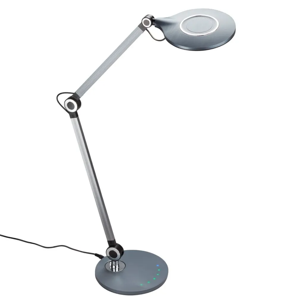 Denne LED-bordlampe har et moderne design og passer ubesværet ind i moderne indrettede kontorer eller hjemmekontorer. Armaturhuset er lavet af plastik, og den runde lampeskærm kan drejes og drejes frit. Med de to bevægelige arme kan lysindfaldet også tilpasses til enhver situation. Via touch-dæmperen kan lysstyrken dæmpes trinløst for at tilpasse lysstyrken til enhver situation – uanset om det er til computerarbejde eller læsning af filer. Desuden giver bordarmaturet mulighed for at ændre farvetemperaturen i tre trin.