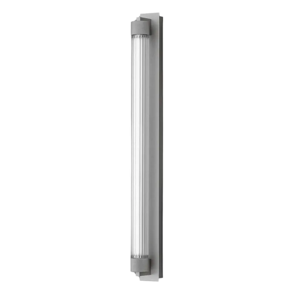 Den rektangulære vægbeslag er fremstillet af jern og aluminium og har en cylindrisk diffusor, der er omgivet af riflede hovedstykker. Borosilikatglasset har et fint, lige rillemønster.