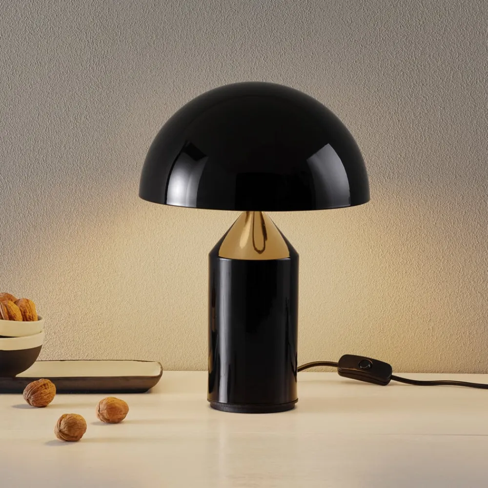 Klassikeren blandt designerbordlamper: Atollo Atollo-bordlampen fra Oluce har et glamourøst og storslået udseende. Den har en cylindrisk lampefod, der spidser til i toppen, og er udstyret med en halvskallet skærm, der danner en enkelt farve med foden. Den halvkugleformede lampeskærm retter lyset nedad på bordoverfladen og skaber en indirekte og meget behagelig accentuering af omgivelserne.