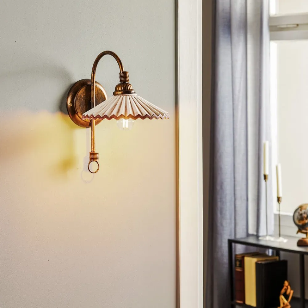 Væglampe Rosina forener rustik landlig stil med en elegant materialekombination af keramik og jern. Den delikate, lyserøde keramikskærm passer perfekt til den antikke bronzefarvede overflade på stativet og skaber dermed en harmonisk atmosfære i ethvert rum. Uanset om det er i stuen, i entreen eller i spisestuen, sætter Rosina væglampe stilfulde accenter og giver interiøret et varmt og indbydende præg.