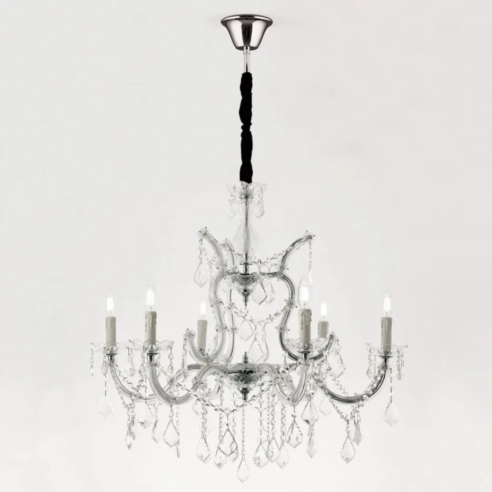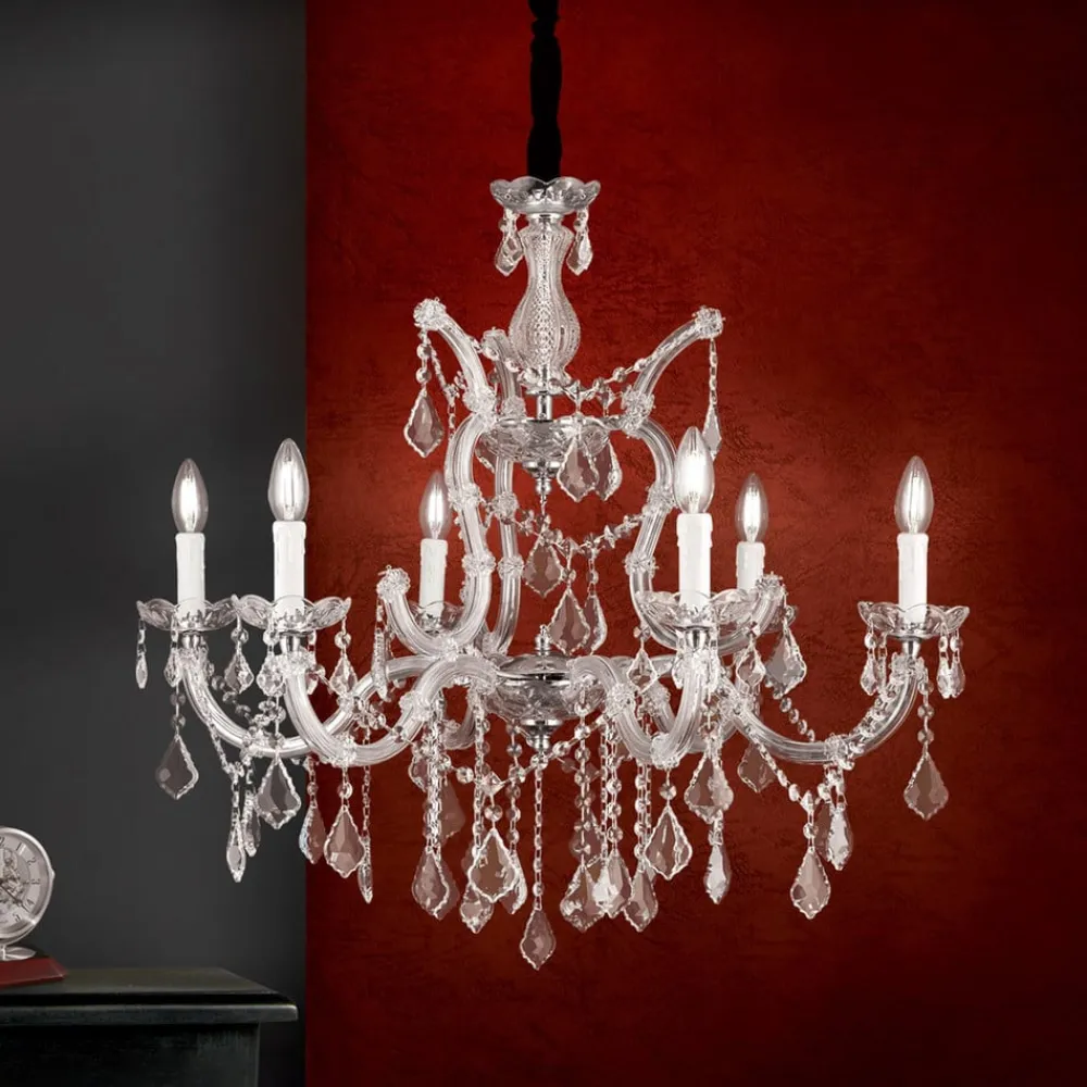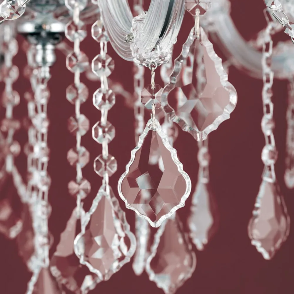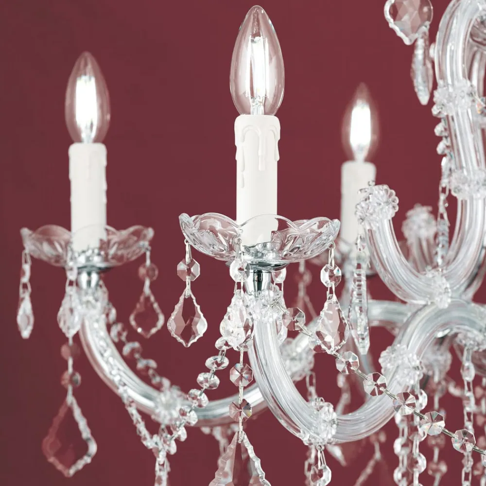 Speciel LILIANA lysekrone i Maria-Theresa-stil og med halvslebet krystalvedhæng. Denne lysekrone kan bruges i enhver indretningsstil, og den giver et enestående strejf af glamour. Lamperne er formet som stearinlys og udstråler romantik kombineret med de smukke krystaller som lysets enestående effekter udstråles igennem. Hengiv dig til barokkens verden og nyd hyggelige øjeblikke fra lyset af denne brilliante lampe.