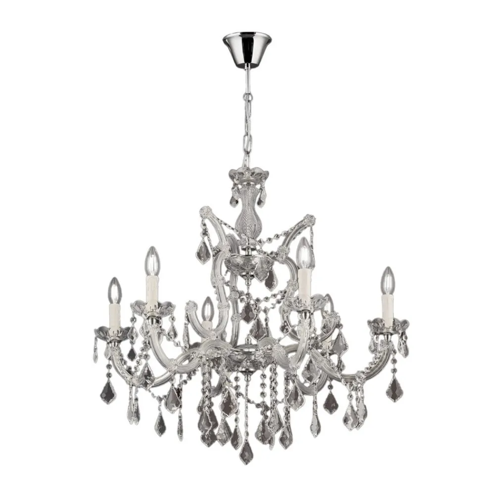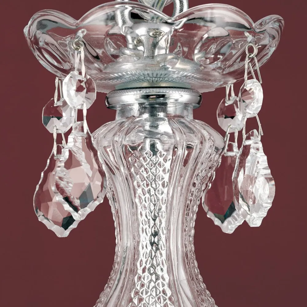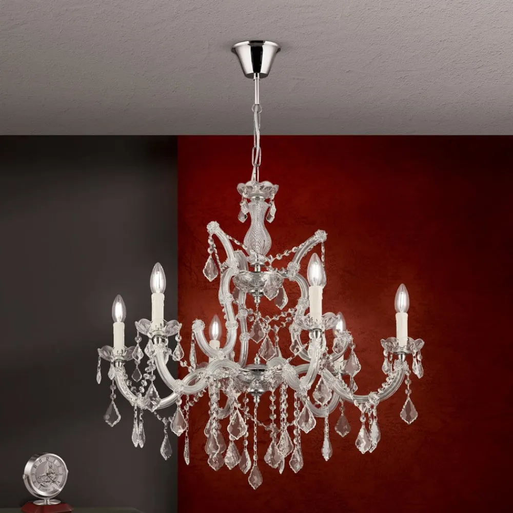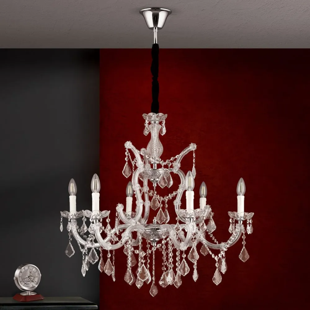 Speciel LILIANA lysekrone i Maria-Theresa-stil og med halvslebet krystalvedhæng. Denne lysekrone kan bruges i enhver indretningsstil, og den giver et enestående strejf af glamour. Lamperne er formet som stearinlys og udstråler romantik kombineret med de smukke krystaller som lysets enestående effekter udstråles igennem. Hengiv dig til barokkens verden og nyd hyggelige øjeblikke fra lyset af denne brilliante lampe.