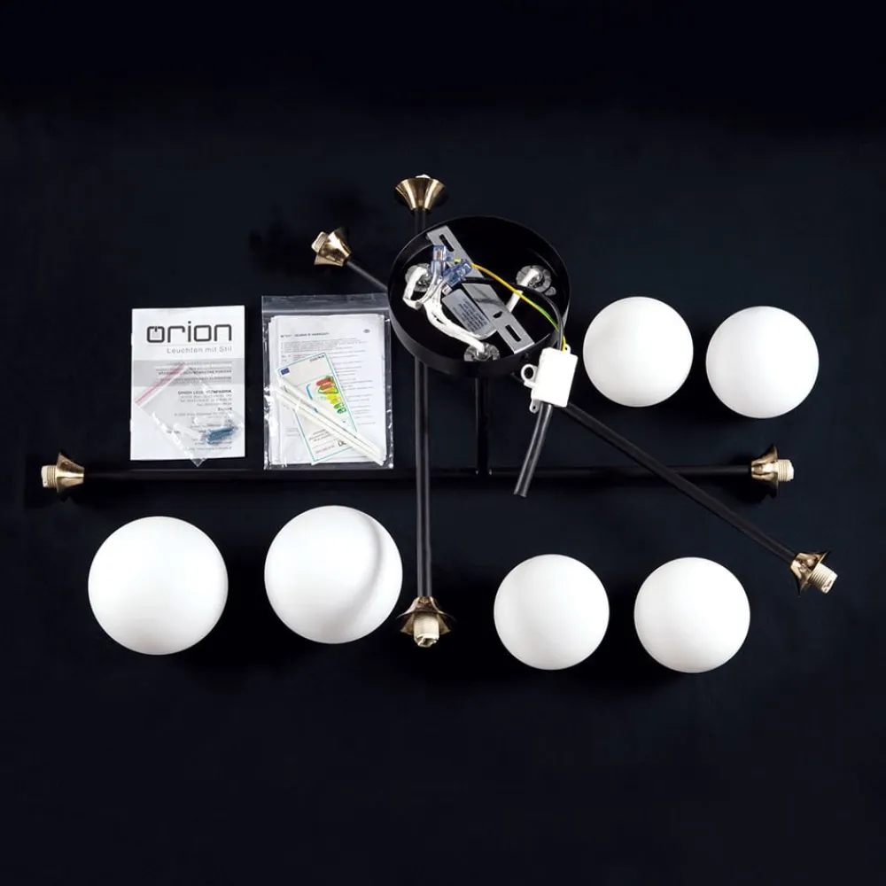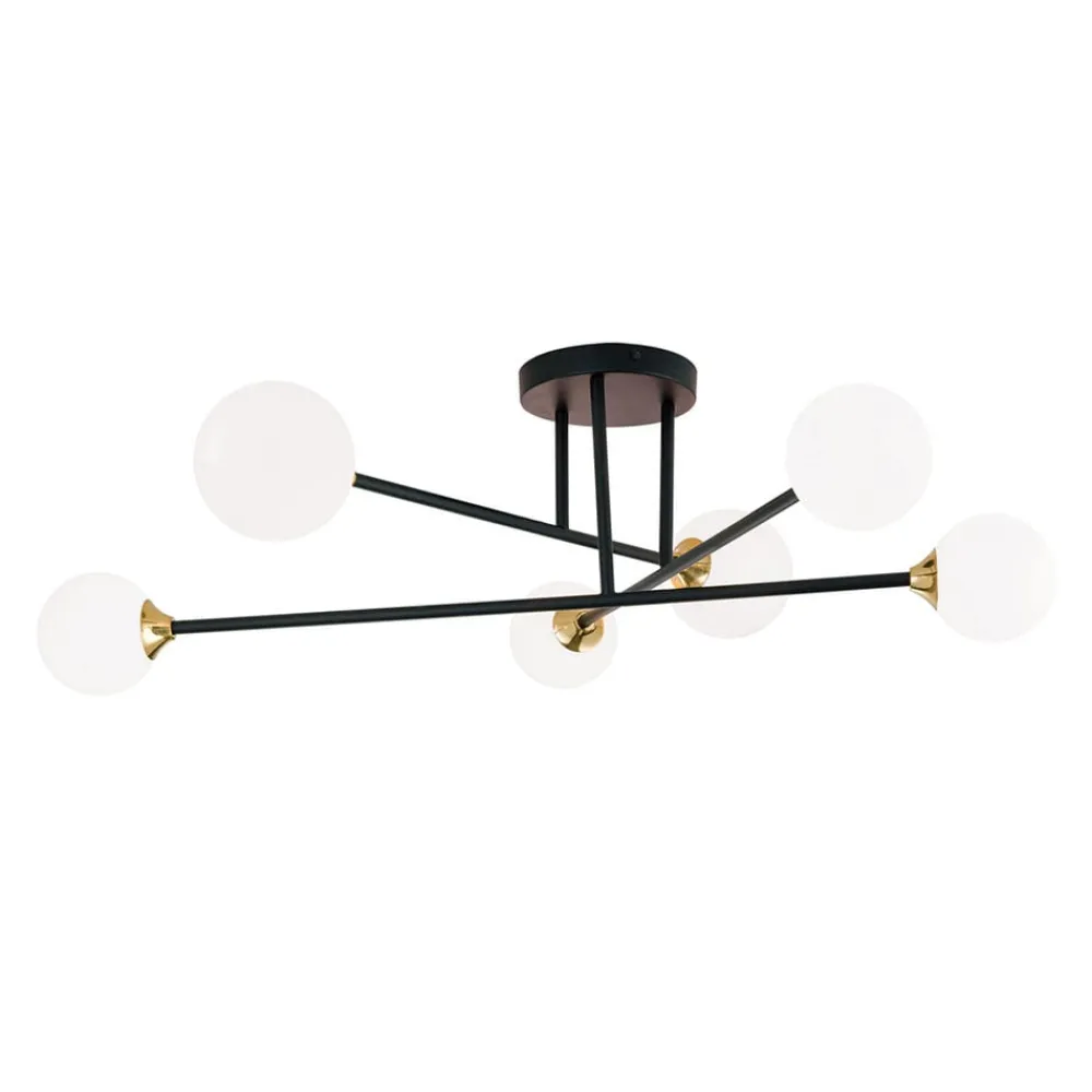 Denne loftslampe kaldes Snowwhite på grund af de seks opalhvide glasskærme i form af en kugle. Disse er placeret i de ydre ender af de tre krydsende metalstænger. Den ret store loftslampe er derfor særligt velegnet til større rum – både i stuen og i soveværelset. Det opalhvide glas gør det muligt for lyset at stråle uden at blænde og meget jævnt i alle retninger. Ved hjælp af dæmpbare pærer og en eksisterende lysdæmper er det også muligt at dæmpe lyset. Pærer er ikke inkluderet i leveringsomfanget.