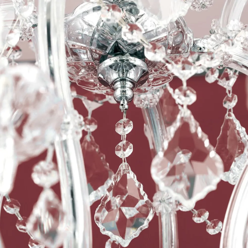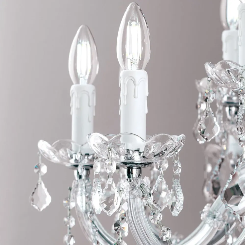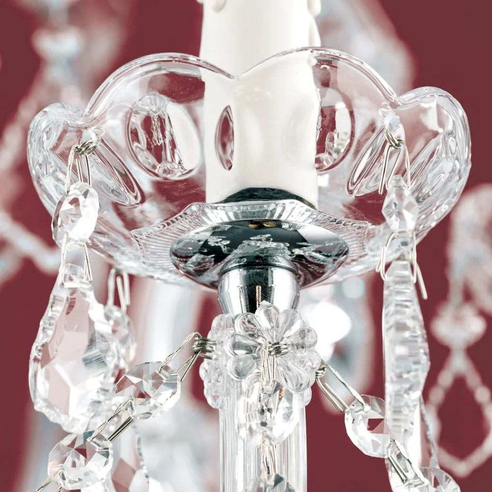 Speciel LILIANA lysekrone i Maria-Theresa-stil og med halvslebet krystalvedhæng. Denne lysekrone kan bruges i enhver indretningsstil, og den giver et enestående strejf af glamour. Lamperne er formet som stearinlys og udstråler romantik kombineret med de smukke krystaller som lysets enestående effekter udstråles igennem. Hengiv dig til barokkens verden og nyd hyggelige øjeblikke fra lyset af denne brilliante lampe.