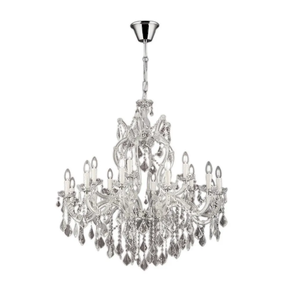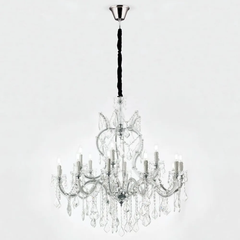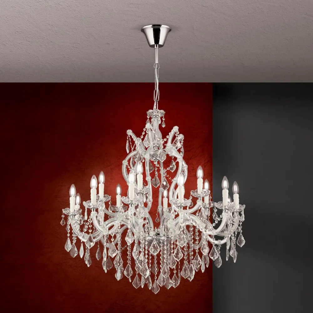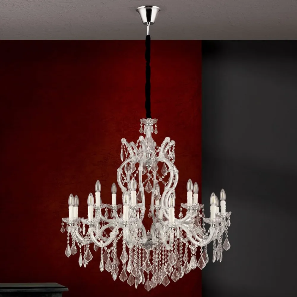 Speciel LILIANA lysekrone i Maria-Theresa-stil og med halvslebet krystalvedhæng. Denne lysekrone kan bruges i enhver indretningsstil, og den giver et enestående strejf af glamour. Lamperne er formet som stearinlys og udstråler romantik kombineret med de smukke krystaller som lysets enestående effekter udstråles igennem. Hengiv dig til barokkens verden og nyd hyggelige øjeblikke fra lyset af denne brilliante lampe.