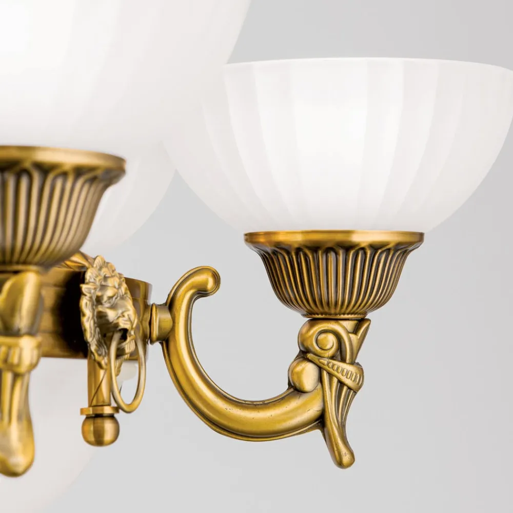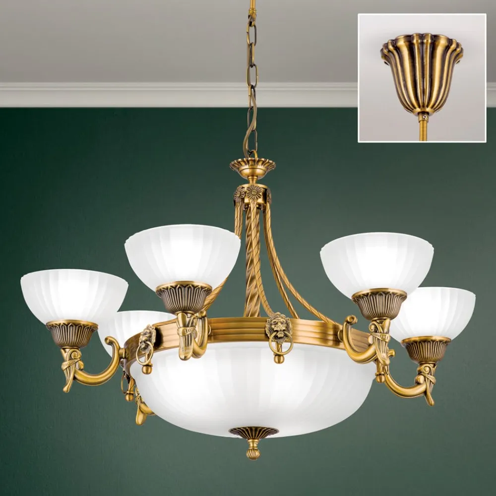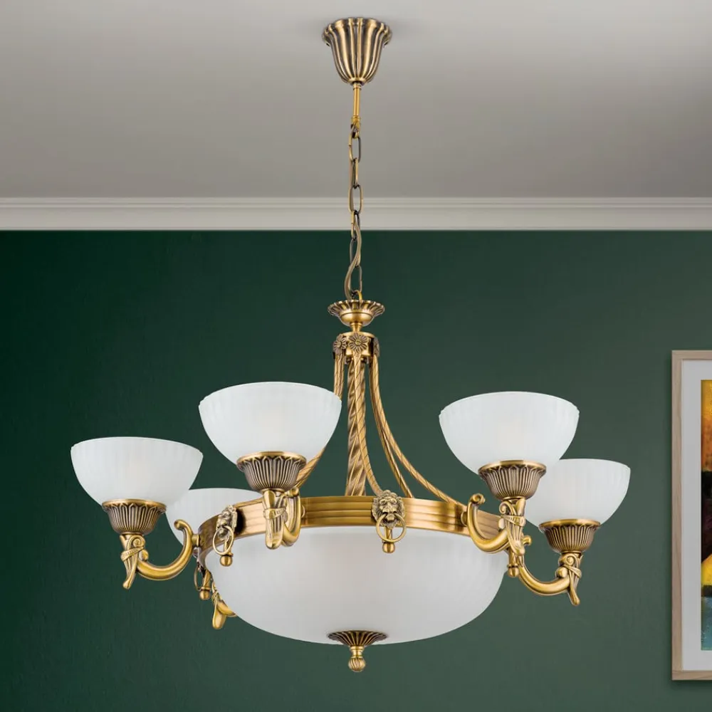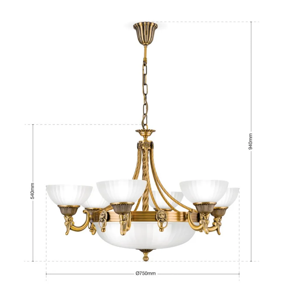 Imponerende Rocca-lysekrone i klassisk lookHvem der ønsker at supplere en klassisk indretningsstil i stue- eller spisestuer eller i et indgangsparti, er med Rocca-lysekronen på rette vej. Den attraktivt designede metalramme præsenterer sig med mange detaljer og et bronzefarvet look. Ensemblet suppleres af hvide glasskærme, der giver nedadrettet, indirekte lys og dermed fremmer en meget effektiv, men afbalanceret og stemningsfuld almenbelysning.