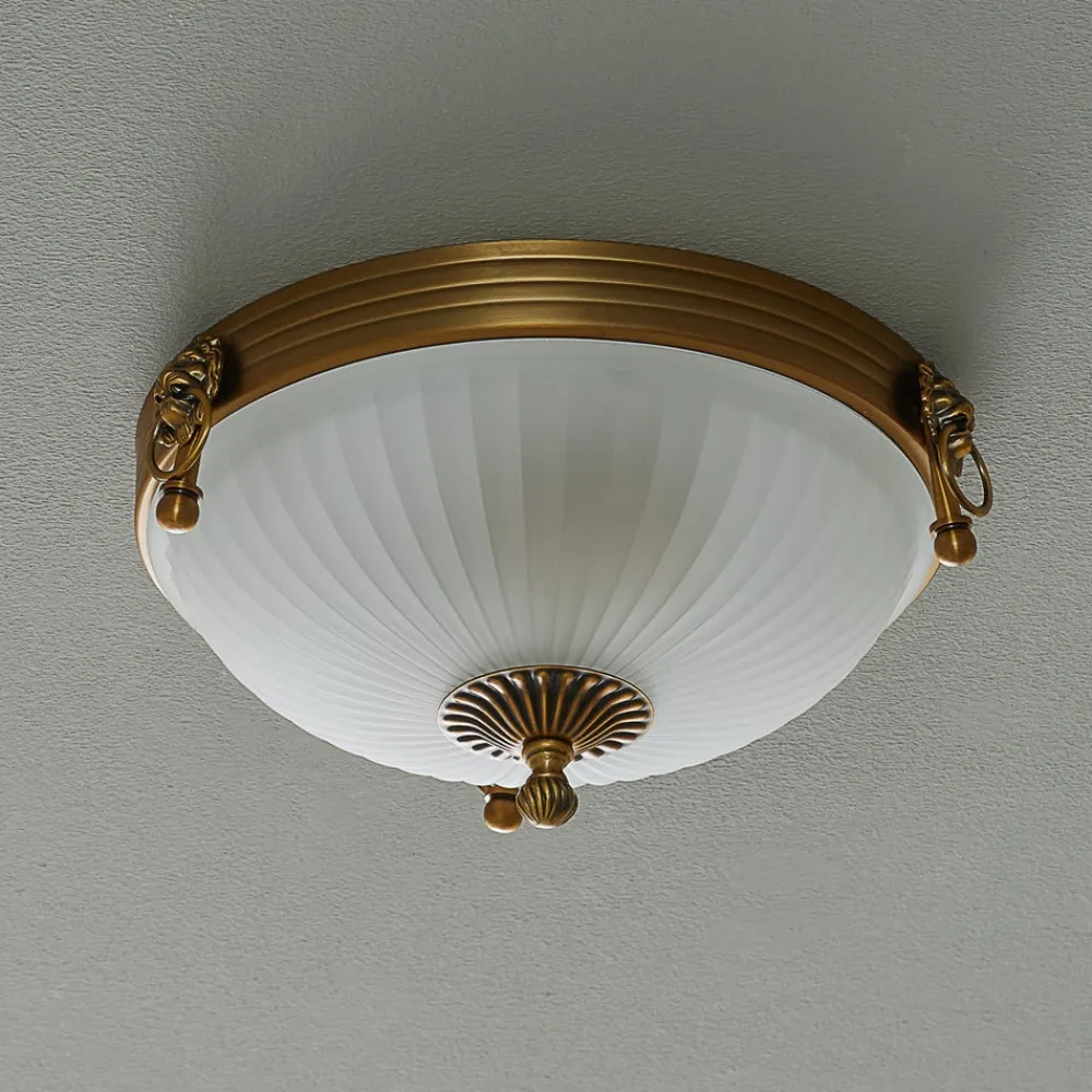 Ædel Rocca loftlampe til glamourøse øjeblikke De bronzefarvede metalelementer i denne imponerende loftlampe er detaljeret udformet, hvilket giver Rocca en unik effekt. Armaturet, der er udstyret med et opalt glasdæksel, oplyser rummet uden at blænde og udsender et blødt lys, der skaber en vidunderlig atmosfære.
