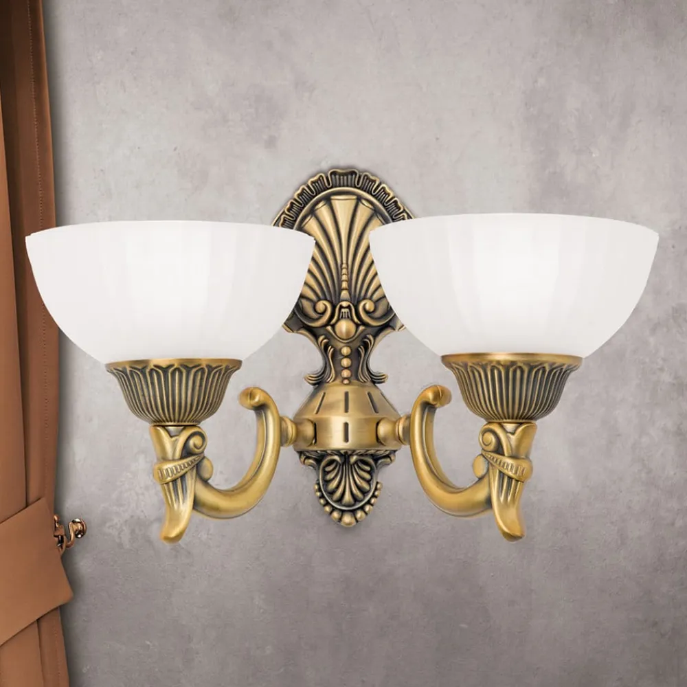 Detaljeret Rocca-væglampeTo hvide skærme og en detaljeret metalramme i klassisk bronze-look kendetegner Rocca-væglampen. Den to-lampe version giver et jævnt blødt ekstra lys i forskellige rum og kombineres bedst med en klassisk indretningsstil. Det indirekte lys bidrager dog ikke kun til belysningen, men sætter også væglampen perfekt i scene, som har en tendens til at se statelig ud.