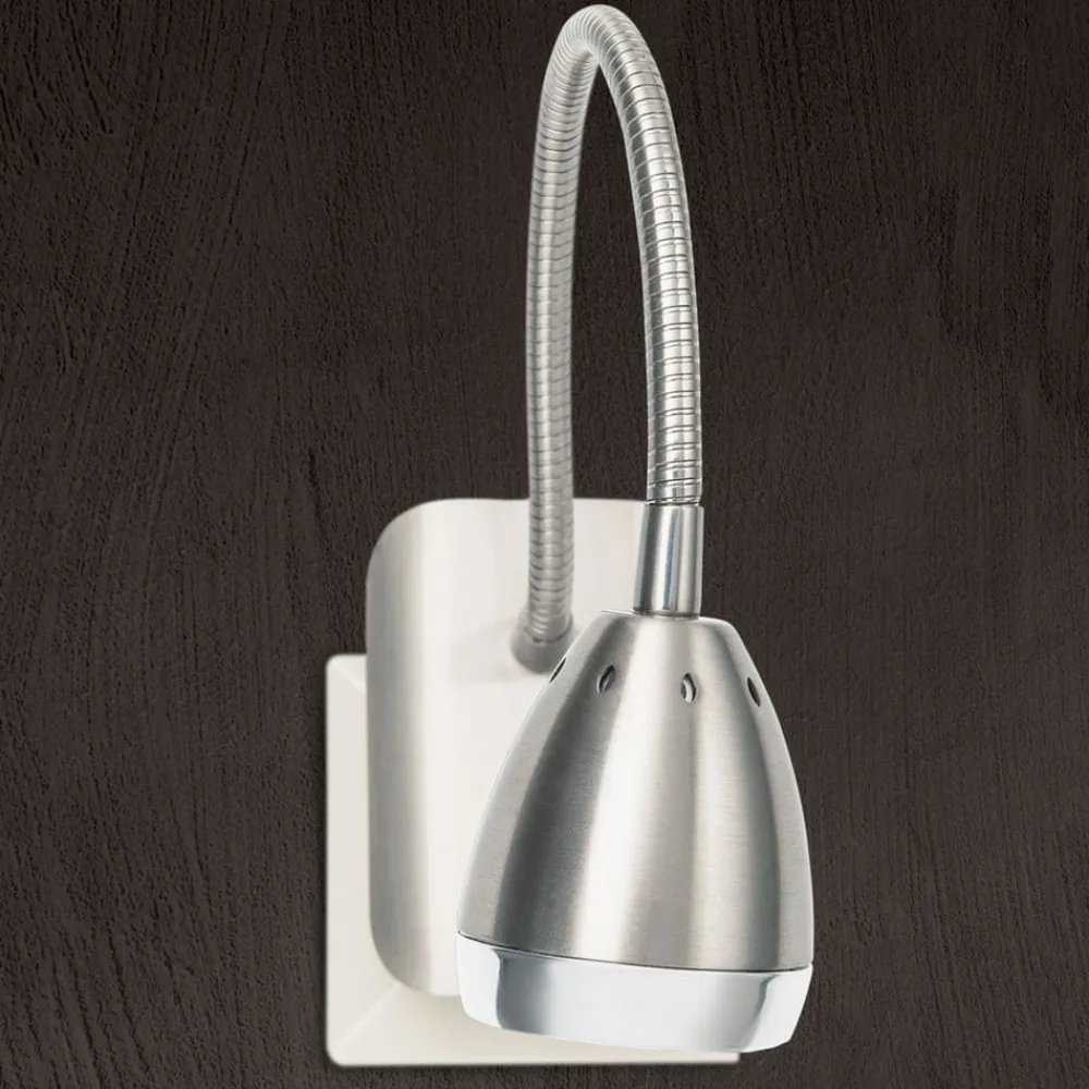 Stikkontaktlamper viser sig altid at være praktiske, når der allerede er en stikkontakt ved hånden på det ønskede sted, fx ved siden af sengen i hovedhøjde, og man ønsker en kabelfri belysning. Når den først er sat i, har man med LED-stikkontaktlampe Manvel muligheden for at tænde og slukke den med vippekontakten på kabinettet. Desuden kan man pege dens lyskegle i den ønskede retning ved hjælp af svanehalsen, så at man kan læse eller udrettede andre vigtige opgaver, der kræver gode visuelle betingelser. Udseendemæssigt scorer Manvel point med en satineret krop af nikkel, som er forsynet med en skinnende nikkelring i toppen af lampehovedet.