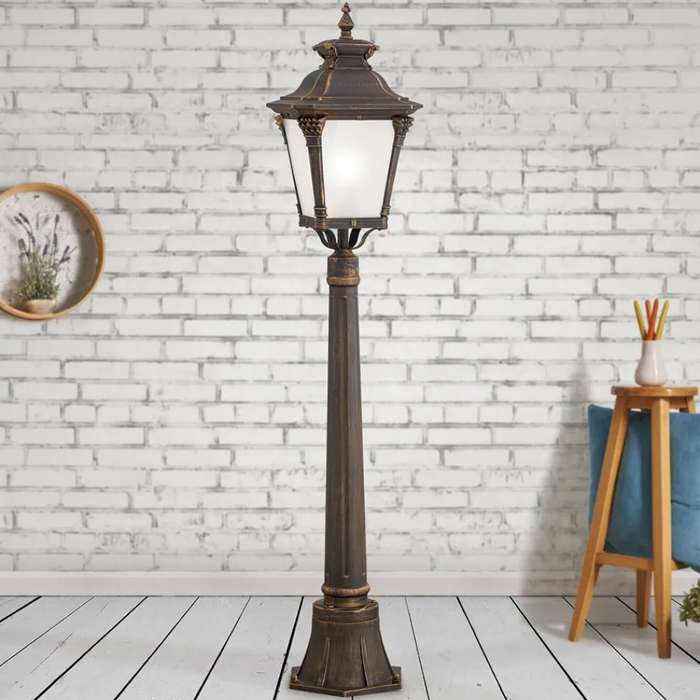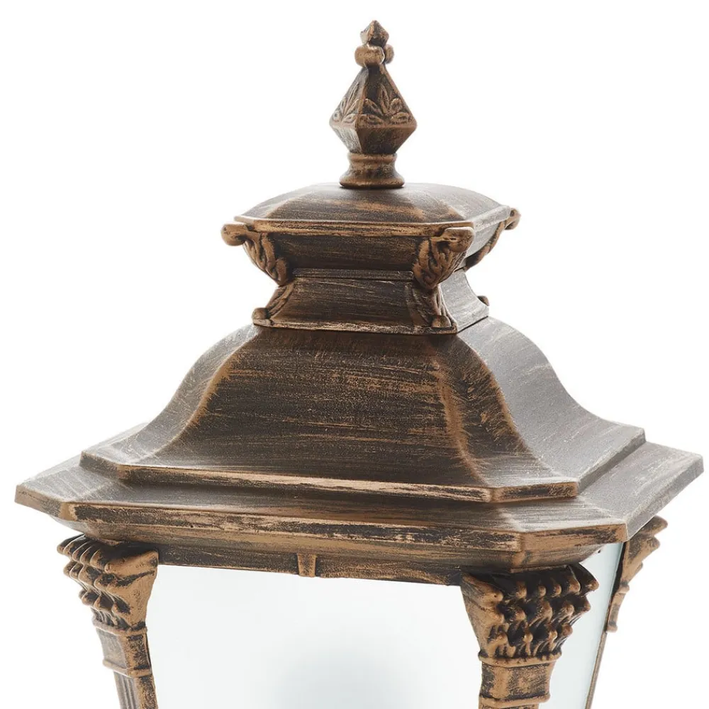 Aiko stibelysning – lanterneformet antikt armatur til udendørs brug Armaturets imponerende og autentiske udseende transporterer beskueren ind i en anden, drømmende verden. Dette armatur ser ud som om det er kommet fra en anden tid og skaber dermed nostalgiske tanker. Lampeskærmens ruder er satinerede for at undgå blænding af lyset. Dette får lyset til at virke blødere og varmere.