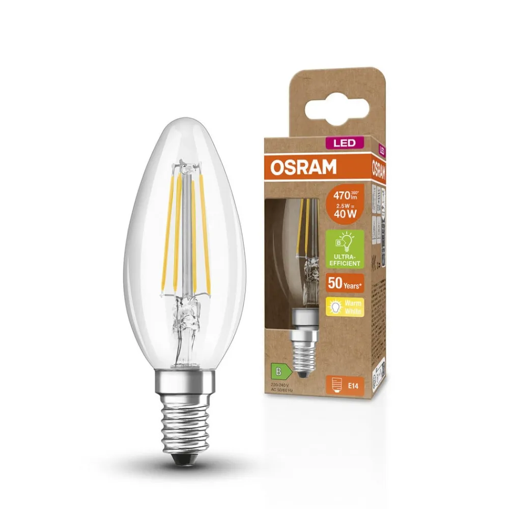 LED-lys Classic E14 2,5 W med synlige glødetråde, 2.700 KDette LED-lys Classic til E14-fatninger med 2,5 W fra OSRAM er et energieffektivt alternativ til konventionelle glødelamper. Det har en sammenlignelig effekt på 40 W og en meget høj effektivitet på op til 188 lm/W. Med en gennemsnitlig levetid på 50.000 timer og et antal koblingscyklusser på 500.000 er den særligt holdbar. Lyskilden fås i den klassiske minilampeform og har et klart glashus med synlige filamenter, der giver en varm hvid lysfarve på 2.700 K. Den er ideel til dekorative armaturer. Den er ideel til dekorative armaturer, husholdningsbrug og generel belysning. Ved udendørs brug bør den kun bruges i udendørs armaturer med mindst IP65.Særlige egenskaber:- Ekstremt god koblingsmodstand: 500.000 koblingscyklusser- God gennemsnitlig levetid: 50.000 timerBemærk: Kan ikke dæmpes.