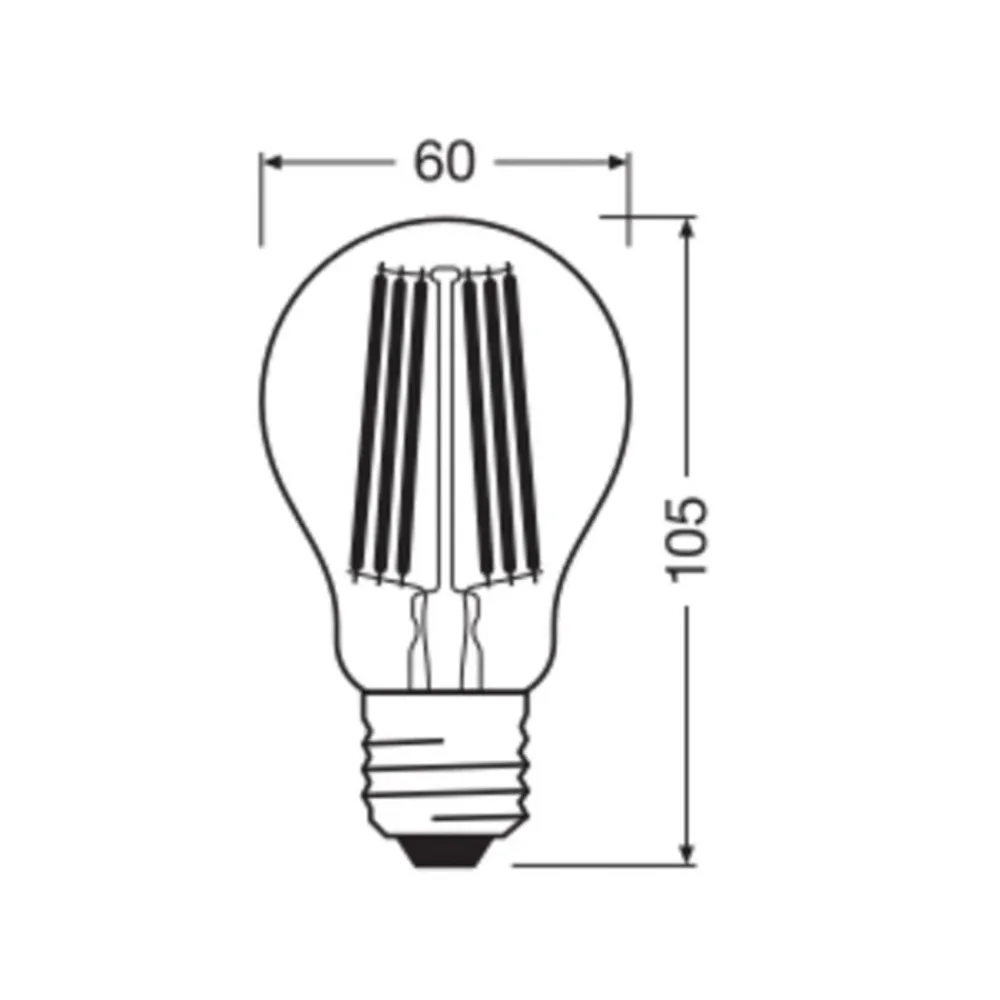 OSRAM Classic LED-pære, filament, E27, 7,2 W, 4.000 K – fremragende energieffektivitet Denne E27 LED-pære er udstyret med en klar glaskolbe og LED-filamenter. Den er særligt effektiv og giver en lysstrøm på 1.521 lm (svarende til en konventionel 100 W-pære) ved kun 7,2 W. Derudover imponerer denne lyskilde med en universel hvid lysfarve og en meget lang gennemsnitlig levetid. Tekniske egenskaber – fremragende lysudbytte (211 lm / W), ekstremt økonomisk (A-mærke) – meget lang nominel levetid (50.000 driftstimer) – enorm koblingsstabilitet (500.000 koblingscyklusser) Bemærk: Kan ikke dæmpes.
