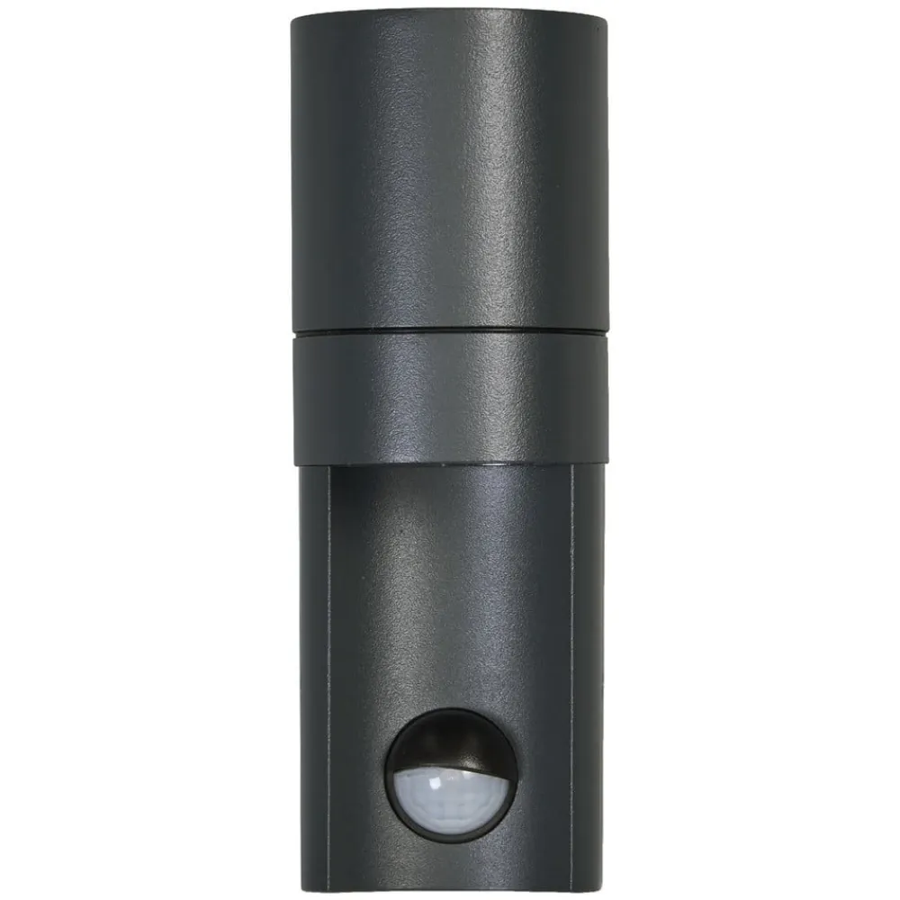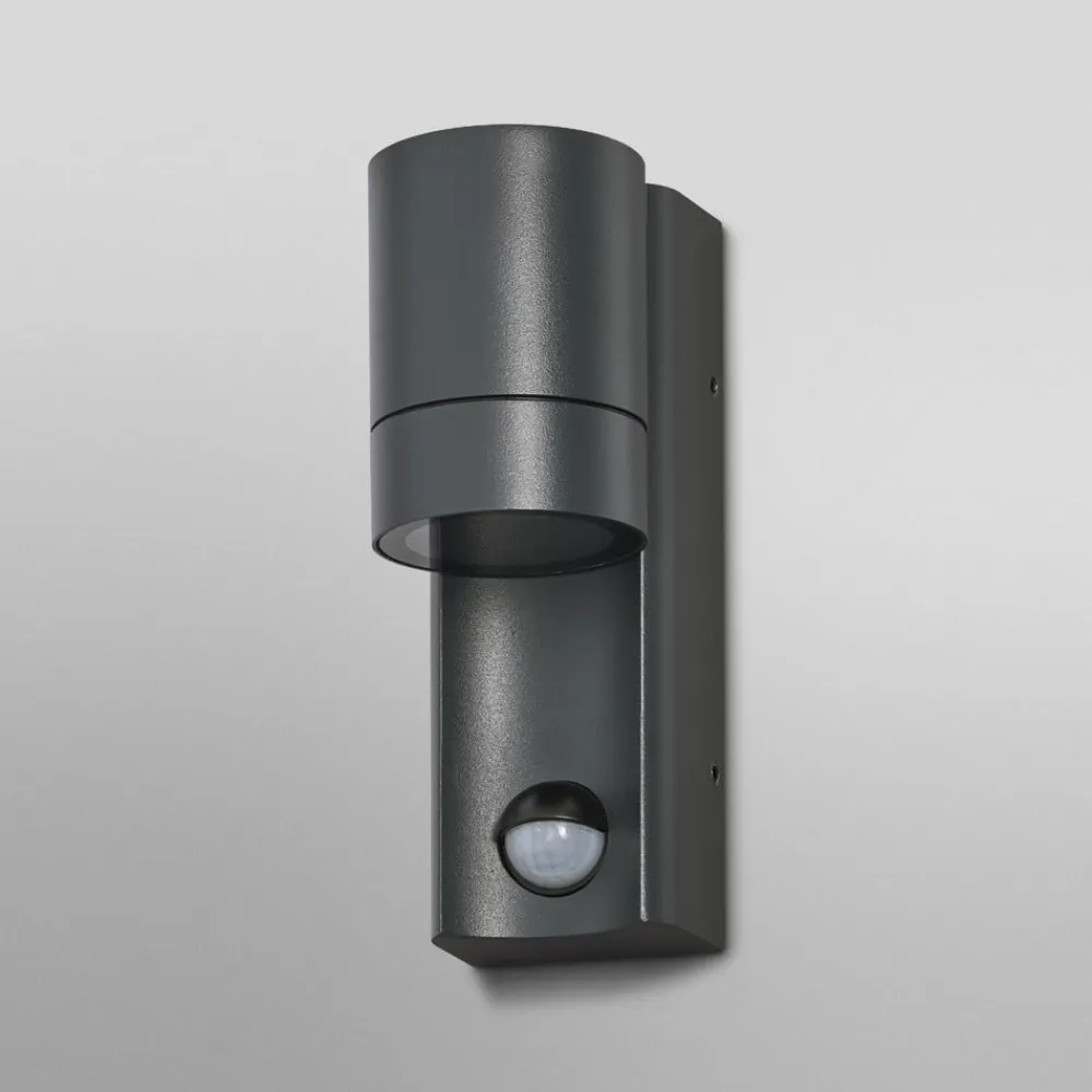 Væglamper med mørkegråt hus i trykstøbt aluminium, kapslingsgrad IP65, mat diffusor og G10-fatning. Produktegenskaber: Tilgængelig med PIR-bevægelsessensor og dagslyssensor. Indirekte belysning. Hus i trykstøbt aluminium. Diffusor i glas eller PMMA. Kabinetfarve: antracit. Produktfordele: Stor fleksibilitet ved valg af pære takket være GU10-fatning. Enkel og hurtig installation. Anvendelsesområder: Belysning af facader. Indgangsbelysning. Terrasser, altaner. Stibelysning. Indkørsler. Teknisk udstyr: Komplet monterings- og tilslutningsudstyr medfølger. Pærer medfølger ikke. Sikkerhedshenvisninger: Alle elektriske tilslutninger må kun udføres af kvalificeret fagpersonale. Forsigtig, fare for elektrisk stød. Produkt i beskyttelsesklasse I. Alle elektrisk ledende, metalliske kabinettedele, der under drift eller ved fejl under vedligeholdelse kan blive spændingsførende, skal være forbundet med jordlederen.