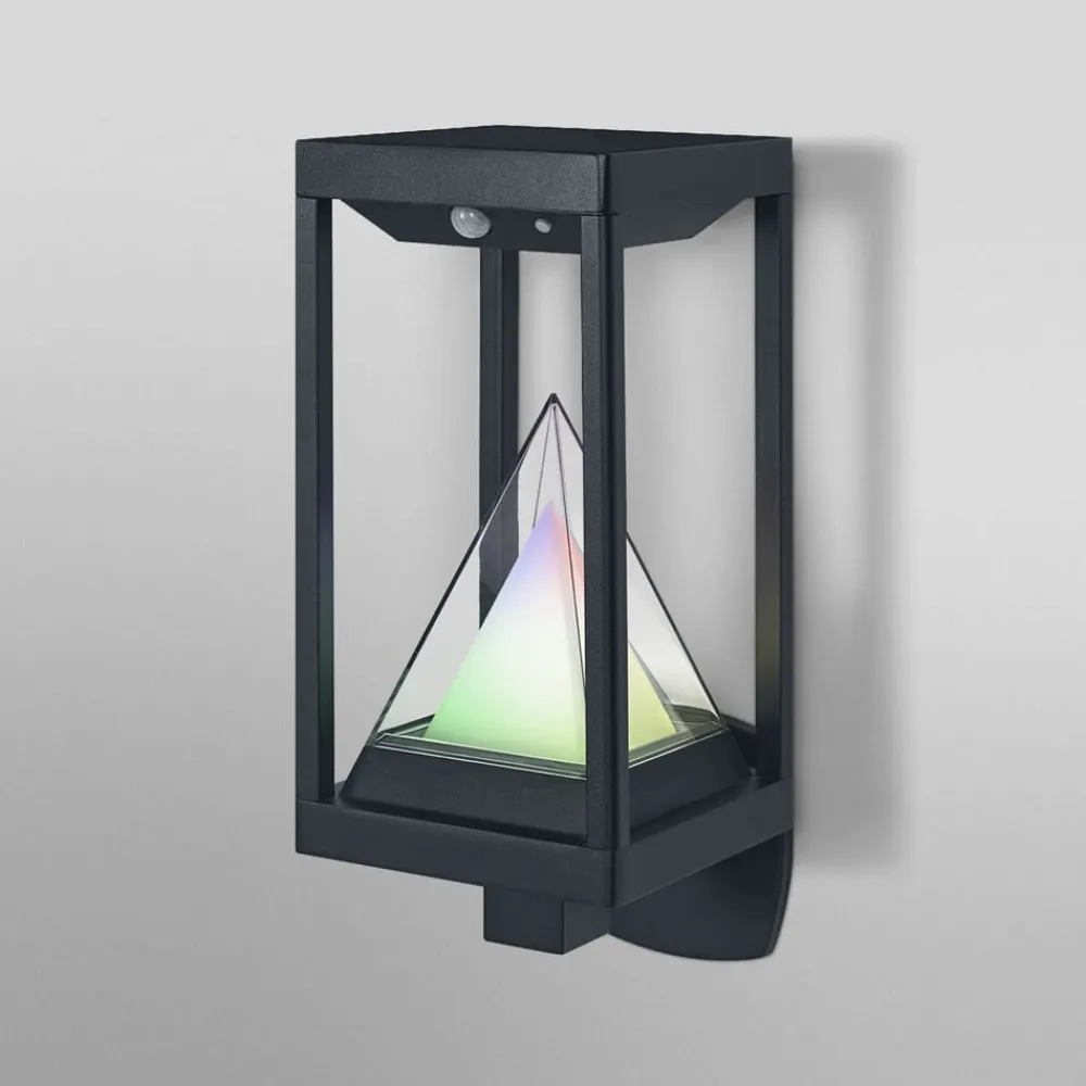 Udendørs LED-væglampe til vægmontering Alps flerfarvet er en solcelledrevet LED-væglampe, der er fremstillet af aluminium og polycarbonat i et moderne design. Den er udstyret med bevægelses- og dagslyssensor og giver belysning efter behov. Farvet eller varmhvidt lys med justerbar lysstyrke kan styres via app eller stemmekommando efter parring via Bluetooth. Solcellelampen er hurtig og nem at installere og kombinerer funktionaliteten af almindelig belysning og stemningsbelysning