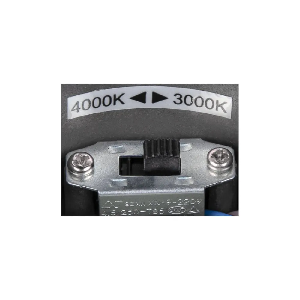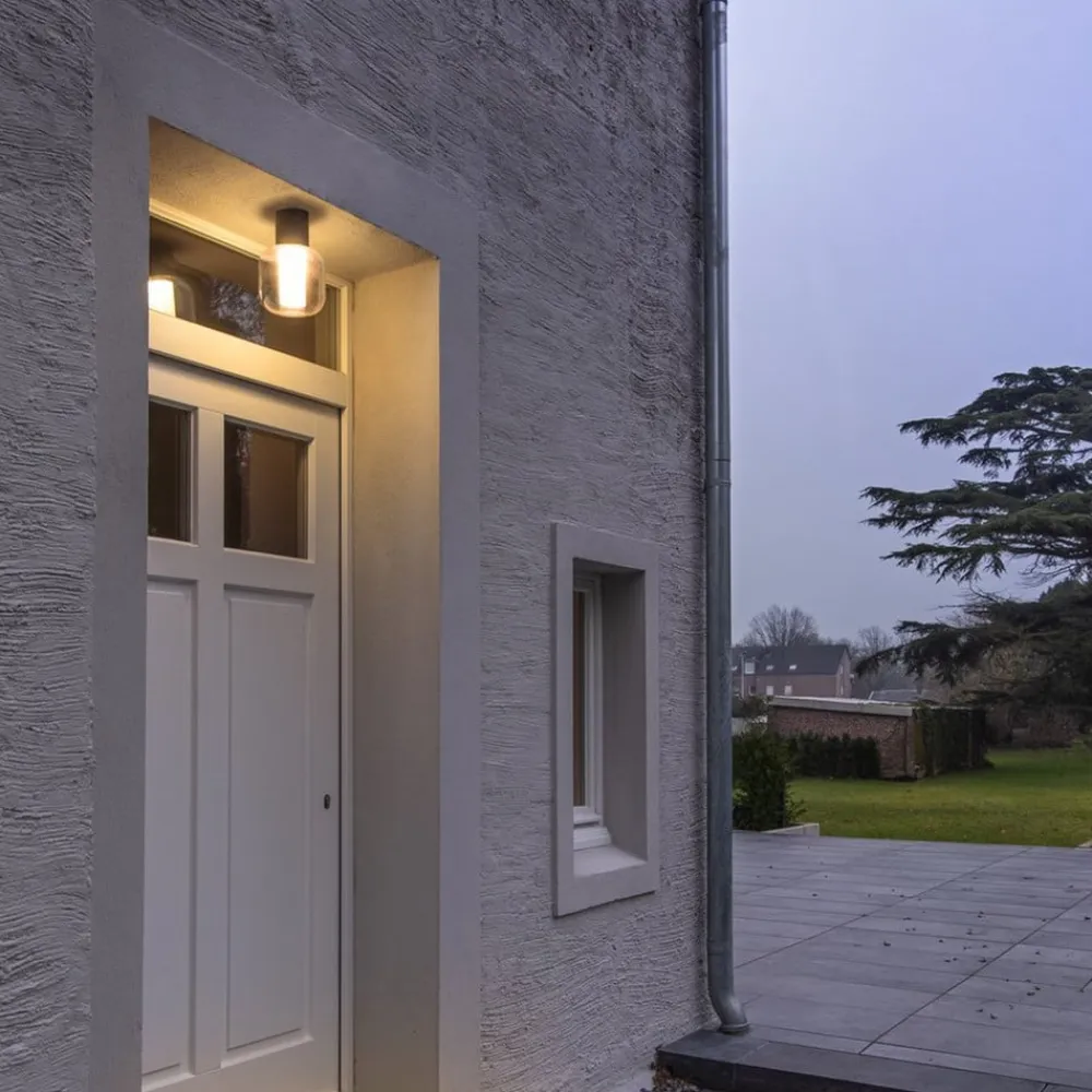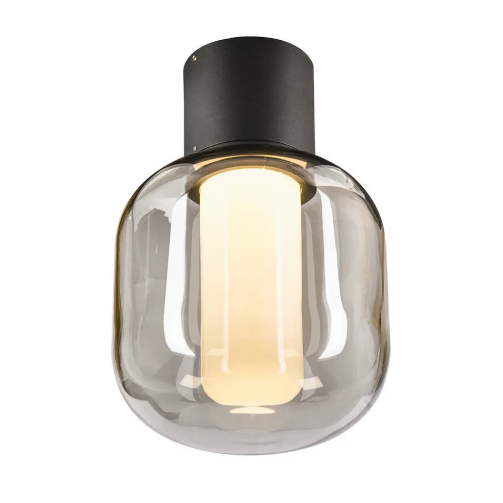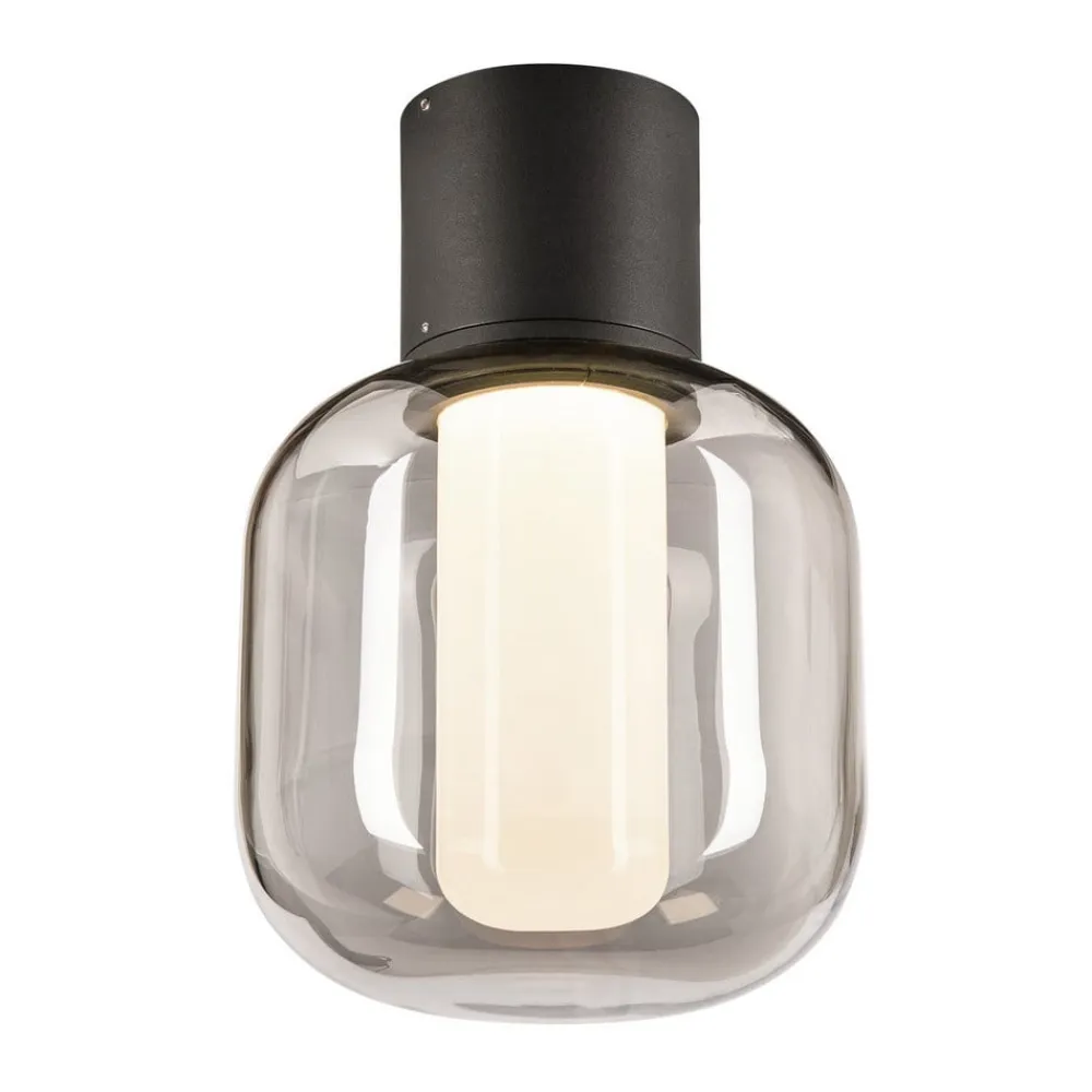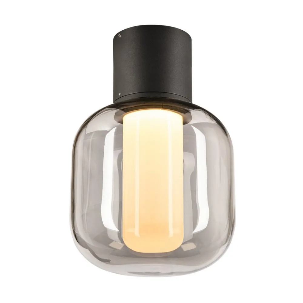 Ovalisk LED-udendørs loftslampe med røgfarvet glasskærm og CCT-funktion Denne Ovalisk-serie til udendørs brug står for stilfuldt, moderne design. Loftslampen har en cylindrisk grundform, hvor LED-lyskilden sidder i en mat diffusor, der udsender lyset jævnt hele vejen rundt. Den er omgivet af en oval, afrundet skærm af røggråt, transparent glas, som er monteret under et antracit-sort loftsbeslag af aluminium. Det særlige ved Ovalisk LED-loftslampen er den justerbare lysfarve, som kan indstilles til varm hvid (3.000 K) eller universal hvid (4.000 K) ved hjælp af en lille skyder i huset før installation – Lysudbytte ved 4.000 K: 540 lm – Omgivelsestemperatur under drift: – 20°C til + 45°C