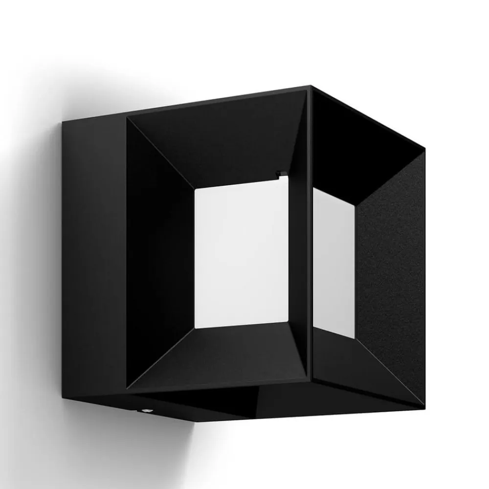 Den sorte LED udendørs væglampe Parterre er fremstillet af robust aluminium og plast, og den minder om en svævende terning som den hænger på husfacaden, idet lampekroppen er designet således at den omkranser plastterningen, hvormed den på smukkeste vis fremhæver denne form, hvad enten lampen er tændt eller slukket. Dermed opstår der ikke blot et unikt udseende på væggen, men der skabes også et vidunderligt ensartet lysbillede, idet lyset udsendes i omgivelserne fra alle sider, via plastskærmen.