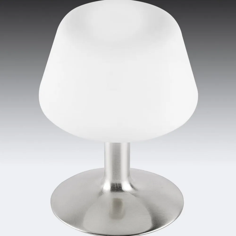 Lille Till bordlampe med stålfarvet fod Till bordlampen er lille, men elegant, med en lampeskærm i satineret glas på en stålfarvet fod. En berøringsdæmper er integreret i lampefoden. Lyset kan justeres til tre lysstyrker ved at røre ved lampens fod. Den lille Till bordlampe er ideel som natbordslampe.