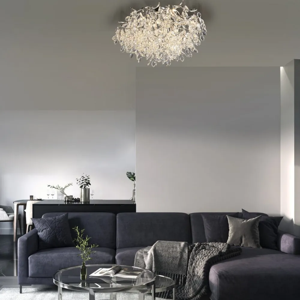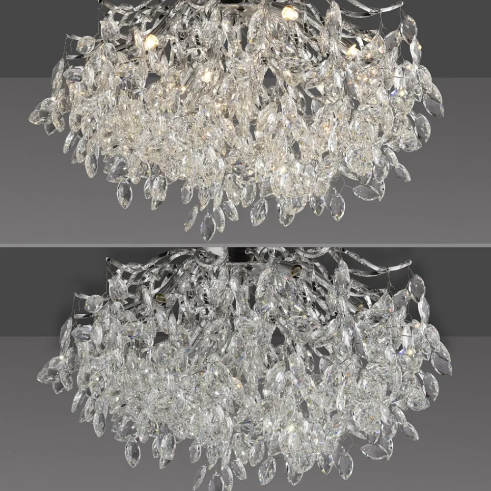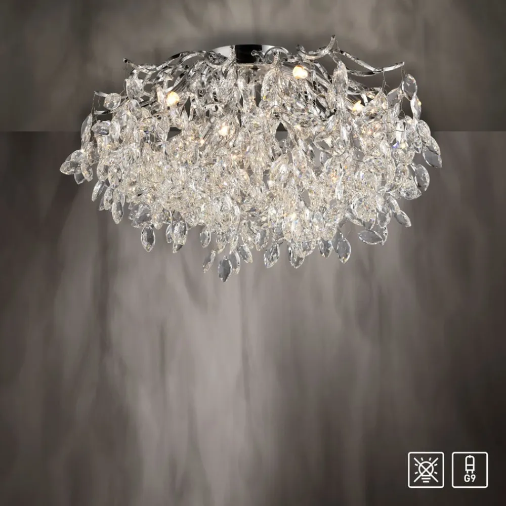 Ricicle loftslampe af forkromet metal med krystalophæng Ricicle loftslampen ser luksuriøs og elegant ud i ethvert rum, uanset om det er stuen, entréen, hotellobbyen, restauranten eller hallen. Det elegante, store armatur af skinnende forkromet metal er udstyret med utallige kæder af funklende krystalvedhæng og skaber et betagende lysspil, som vil fortrylle ethvert rum. Dens pompøse tilstedeværelse og eksklusive udstråling gør lampen til et elegant blikfang i ethvert rum. Loftslampen er udstyret med G9-fatninger, som kan bruges med både LED-lamper og halogenlamper for at holde trit med de nyeste standarder for energieffektivitet. Pendlerne i glaskrystal reflekterer lyset på en fascinerende måde og skaber en indbydende og blændende atmosfære.