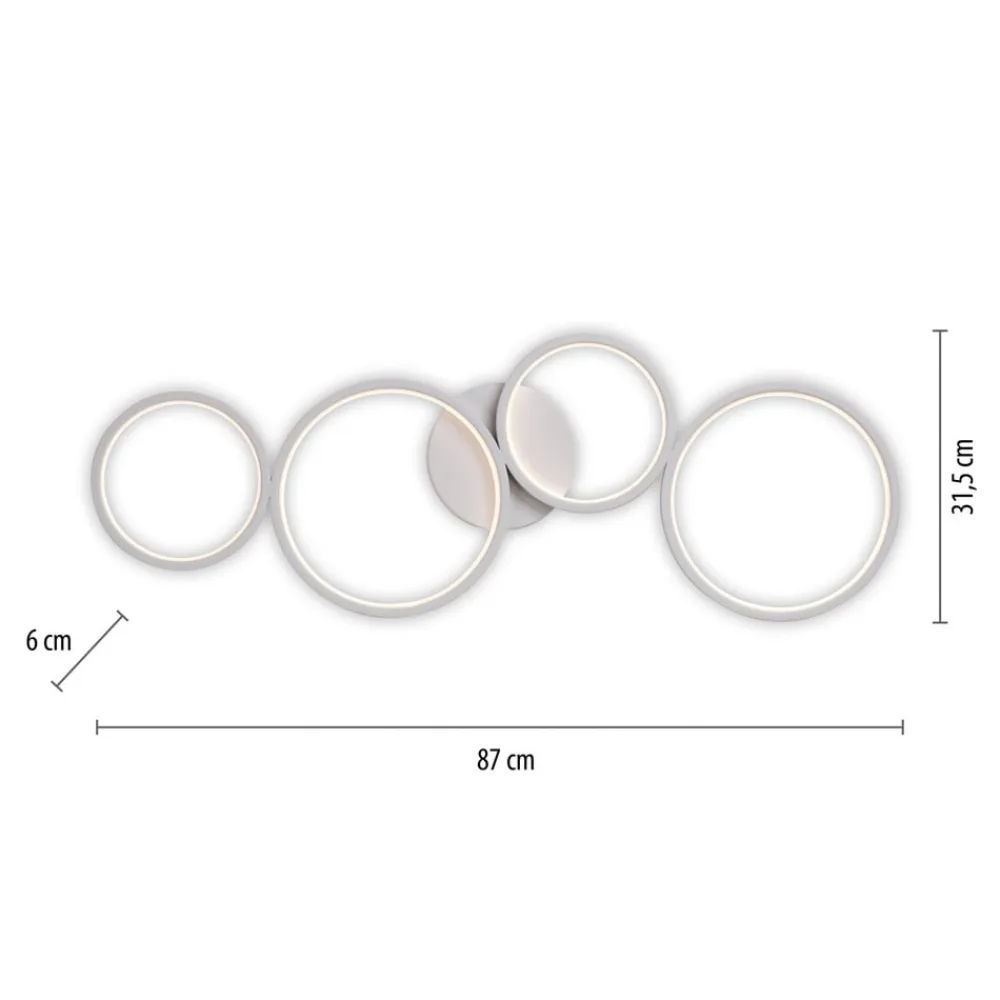 3-trins dæmpbar via vægkontakt: Kiringe LED-loftlampe Den helt hvide Kiringe LED-loftlampe, fremstillet af aluminium og jern, består af fire cirkulære elementer. De integrerede LED’er udsender et kraftigt varmhvidt lys og giver en god almen belysning. Takket være den indbyggede Switchmo-teknologi kan lysets intensitet dæmmes i tre trin ved hjælp af standardvægkontakten.