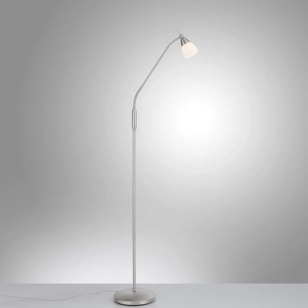 Fleksibel justering: Pino gulvlampe med integreret 3-trins touchdæmper, 3.000 K Pino gulvlampen er den perfekte kombination af tidløs elegance og moderne teknologi. Denne gulvlampe er et smykke til ethvert rum. Dens design passer perfekt ind i forskellige indretningsstile. Takket være den praktiske 3-trins berøringsdæmper kan du ændre lysstyrken og justere lyset, så det passer til dine individuelle behov. Det opale glas sikrer en blid lysfordeling og skaber en behagelig atmosfære. Uanset om du læser, slapper af eller arbejder – denne gulvlampe giver altid det rigtige lys. Armaturet bruger en energieffektiv LED-pære, som ikke kun sikrer en fremragende lyskvalitet, men også har en lang levetid. Med en farvetemperatur på 3.000 Kelvin giver armaturet et varmhvidt lys, der skaber en behagelig og hyggelig atmosfære. Lampehovedet kan justeres efter behov for at skabe fokuserede accenter.