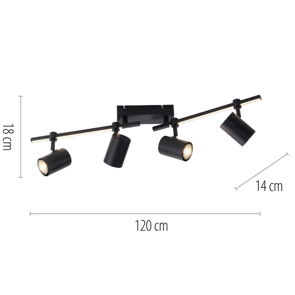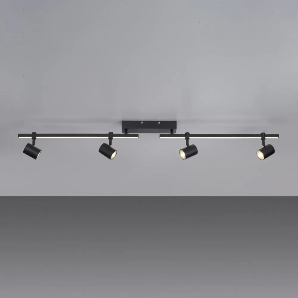 Barik LED-loftspot med fire spots og lyskilder, der kan skiftes separat Det sorte Barik-loftspot imponerer med sit moderne og tekniske design. De fire justerbare spots kan justeres fleksibelt på skinnen for at fordele lyset optimalt i rummet. Armaturet kan installeres på væggen eller i loftet og giver et behageligt, varmhvidt lys. Skinnen er også udstyret med en LED-strip, der skaber en særlig lysstemning. Med den integrerede seriebryder kan begge lyskilder styres enten sammen, kun LED-spottet eller kun spottene via vægkontakten. Fire pærer er inkluderet i leveringsomfanget. Takket være hukommelsesfunktionen gemmes de sidste indstillinger automatisk. På grund af det lave ophæng er lyset også velegnet til rum med lavt til loftet.