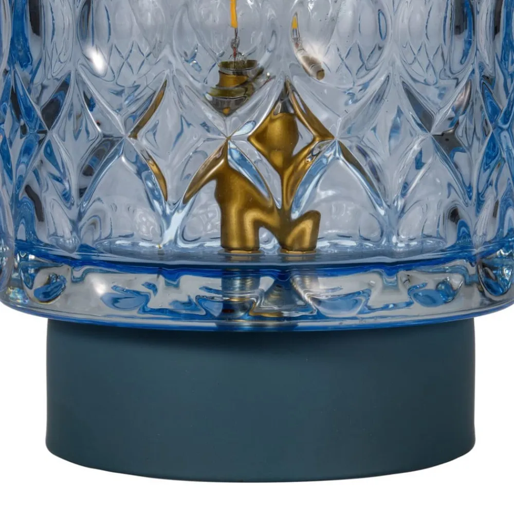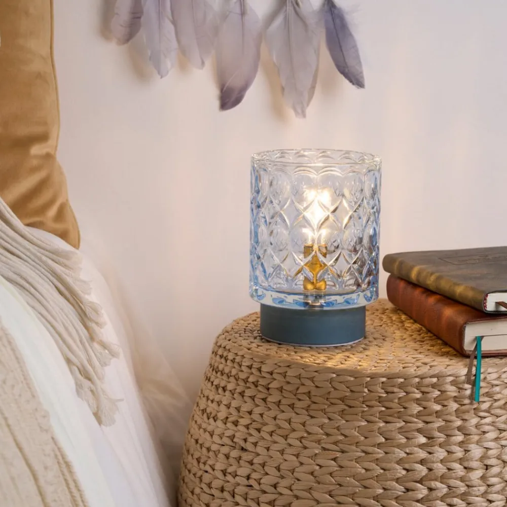 Batteridrevet LED-bordlampe Chic Glamour med glasskærmMed sit æstetiske glas i isblå giver Chic Glamour-bordlampen et behageligt lys i stuen eller soveværelset. Glassets stilfulde struktur og lampefoden af metal gør denne bordlampe til et særligt dekorativt højdepunkt. Placeret harmonisk i enhver stue skaber den en fantastisk lysatmosfære. Batteridriften gør, at du kan placere den mobile bordlampe overalt og igen og igen – uanset om der er en strømforbindelse i nærheden. Den 6-timers timer slukker automatisk for bordlampen. Vores tip: På større borde, f.eks. spisebordet, ser flere af disse lamper bedst ud ved siden af hinanden. Bemærk: Bemærk venligst, at batterier ikke medfølger (3 x AA).