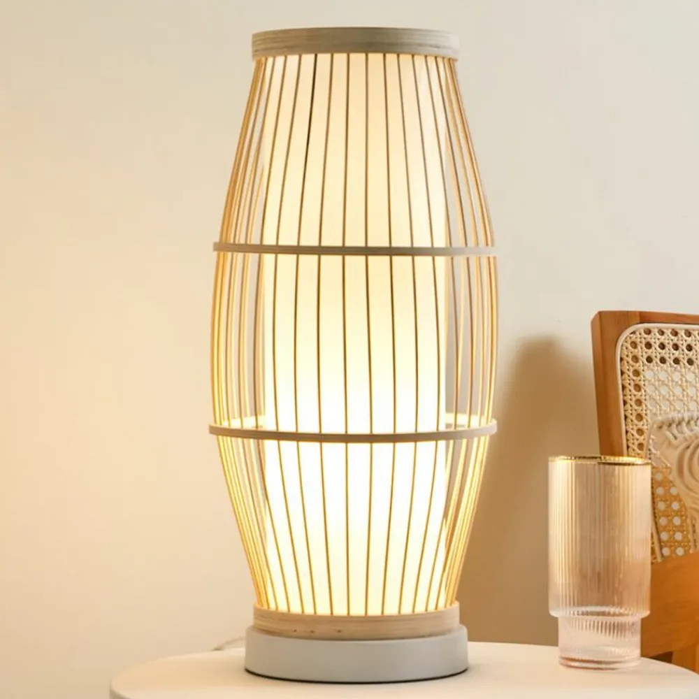 Woody Passion-bordlampen bringer naturlighed og en smule skandinavisk charme ind i ethvert rum. På grund af sin størrelse passer lampen perfekt på et sidebord, en skammel eller endda på en vindueskarm. Over den cylindrisk formede inderskærm af beigefarvet plast ligger den bulbformede yderskærm, som er udformet i et åbent design af individuelle bambusstave. Lampen er udstyret med en vippekontakt i forsyningskablet og et eurostik.