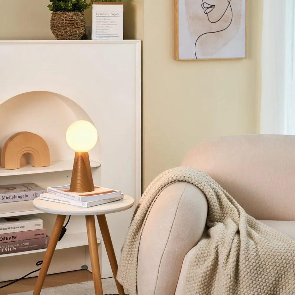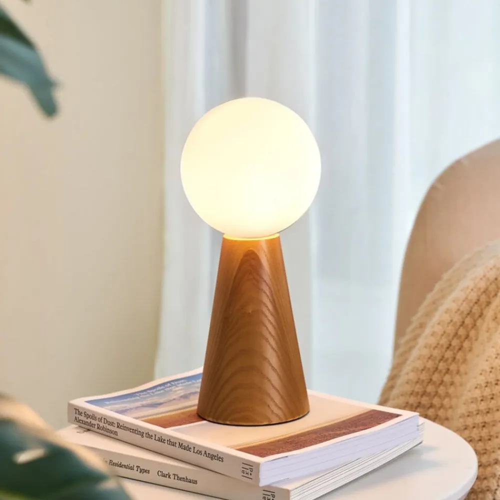Woody Soul bordlampe med konisk træfod og glaskugleskærm Woody Soul bordlampen er en strålende ekstra lyskilde til stuen og soveværelset. Den er udstyret med en kugleskærm af opalglas, som understøttes af en konisk base af asketræ. Der medfølger et plug-in-kabel med afbryder.