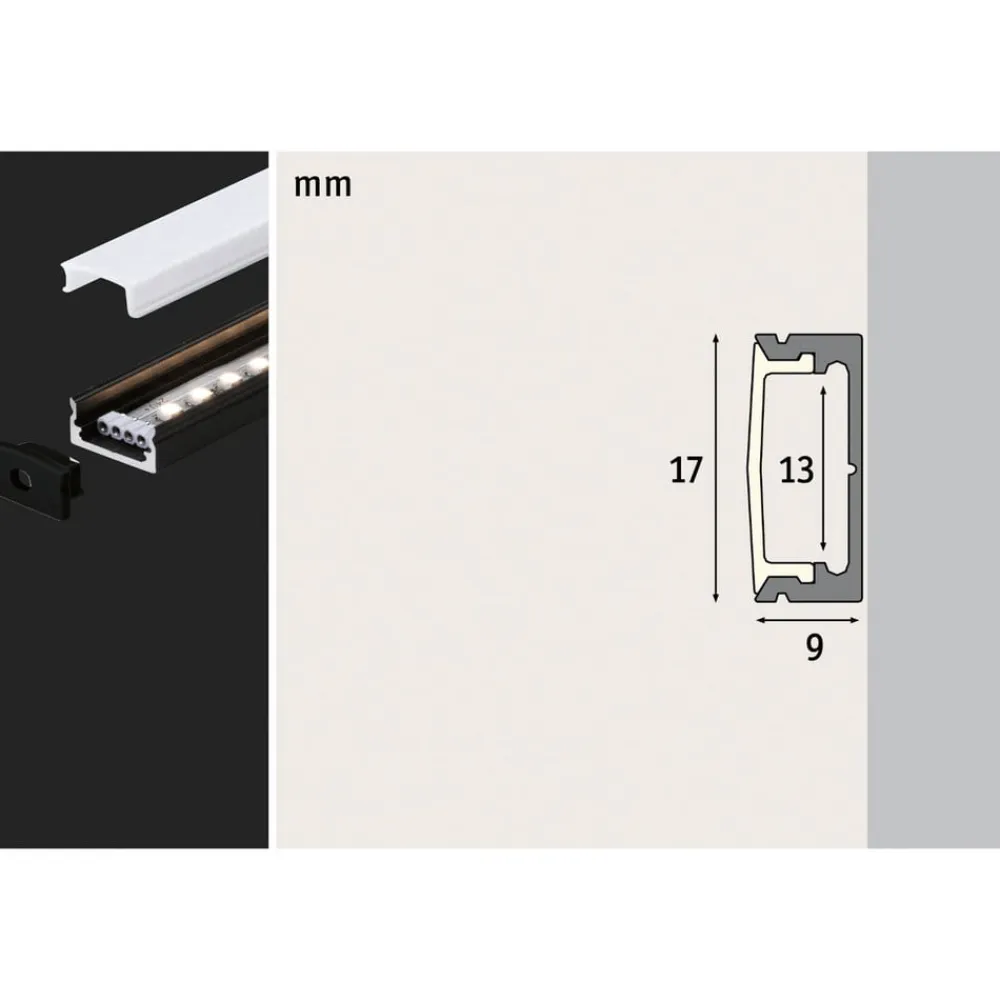 Denne aluminiumsprofil giver en homogen belysning på møbler eller vægge. Den kan monteres med en MaxLED LED-strimmel og har en særlig ensartet lysafgivelse takket være den satinerede plastdiffusor. Den robuste aluminiumsprofil er lakeret i mat sort.