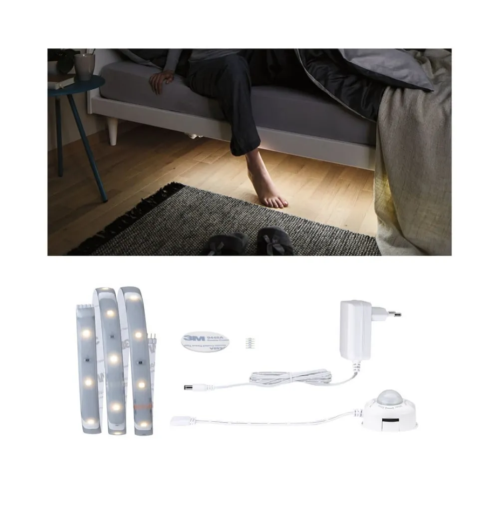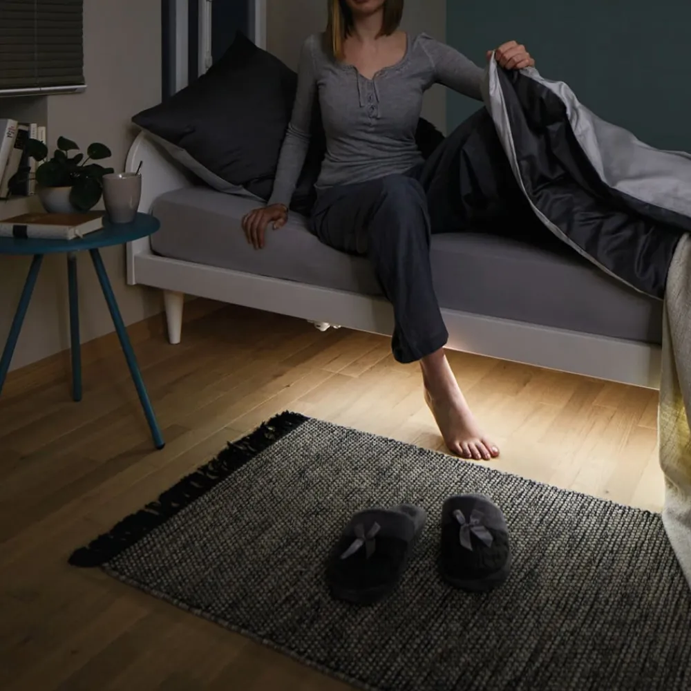 MaxLED 250 Night Comfort Set til en enkeltseng bringer sikkerhed ind i soveværelset og tænder automatisk, når du står op om natten. Striben og sensoren sidder simpelthen fast under sengekanten. En skumringssensor tænder lyset først, når det bliver mørkt, så utilsigtet tænding om dagen undgås. Lysets varighed kan indstilles manuelt mellem 30 sekunder og 6 minutter.