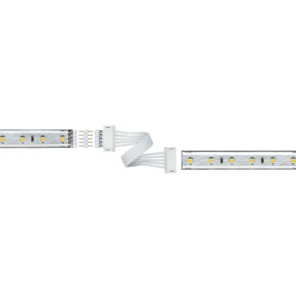 Man kan med denne MaxLED-universalforbindelse uden problemer forbinde afkortede og uafkortede LED-strips med Corner- og Deep-profiler. Den er fremstillet af hvid plast og dermed fleksibelt designet, så forbindelsesstykket kan sættes på i enhver vinkel, som man ønsker. Små højdeforskelle kan ligeledes udjævnes.
