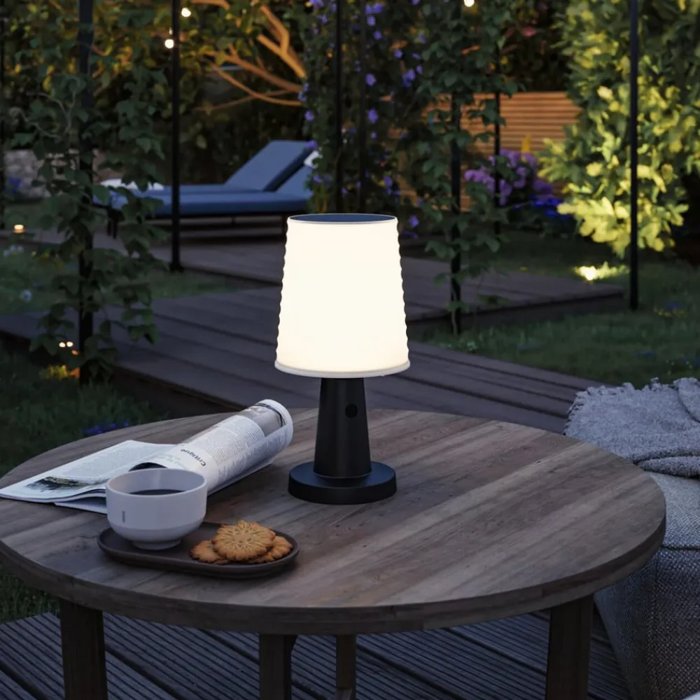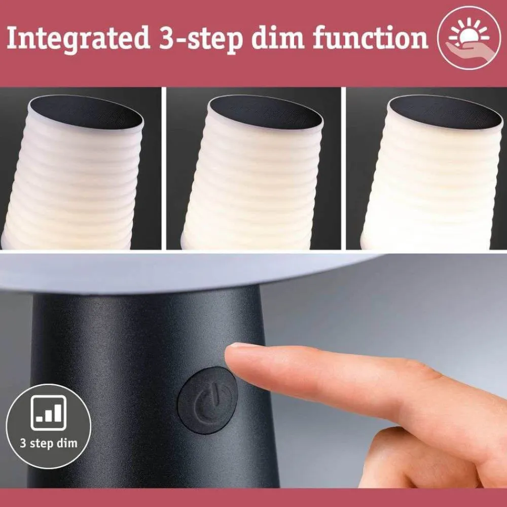 Ilanga Solcelle Lampe Anthracite – Paulmann er den perfekte kombination af bæredygtighed og fleksibilitet. Som en del af Paulmanns sortiment af bordlamper og portable solcellelamper, tilbyder denne lampe en miljøvenlig løsning til dit hjem. Fremstillet af over 50% genbrugsplast, er Ilanga både stilfuld og ansvarlig. Det integrerede solpanel sikrer et effektivt energiforbrug, mens den praktiske USB-C forbindelse giver dig mulighed for at oplade lampen hvor som helst. Med en højde på 30 cm og en diameter på 15 cm, passer den antracitfarvede lampe perfekt både indendørs og udendørs. Skab en hyggelig læsekrog i stuen eller en stemningsfuld atmosfære på terrassen med dens behagelige varmhvide lys. Lampen kan dæmpes i tre trin, så du kan tilpasse belysningen efter dine behov. Med en IP44 beskyttelsesgrad er den vejrbestandig og ideel til udendørs brug.